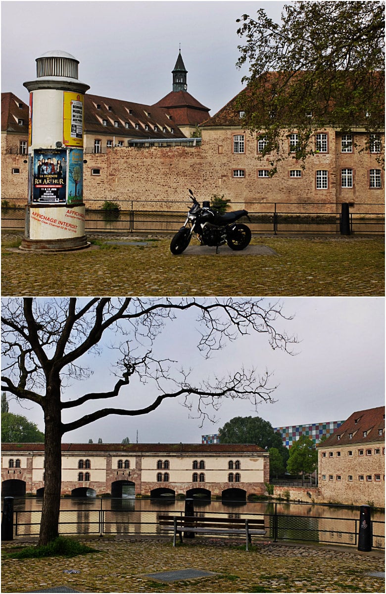 La rue des Ponts-Couverts commence là, au croisement du quai Turkheim et en surplomb du quai de la Bruche. L’on pourrait croire qu’elle n’enjambe qu’un unique pont, et c’est effectivement le cas depuis la fin du XIXème. Dans le passé en revanche, il n’en était rien : fortifiés vers 1330, les ponts sur les quatre chenaux ne deviennent des ponts-galeries (d’où le pluriel et le « couverts »…) qu’au XVIème siècle. Les toits sont recouverts de tuiles, munis de herses et fermés côté amont par une paroi aveugle percée de meurtrières. Ces ponts sont remplacés par des passerelles en 1784, puis reconstruits en pierre en 1865, d’après le Dictionnaire historique des rues de Strasbourg.