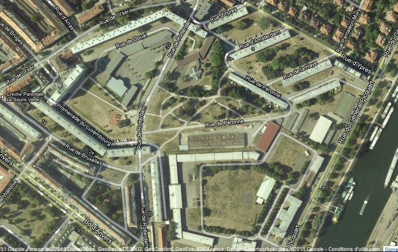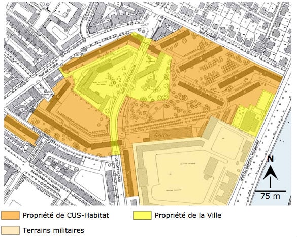 « Avant la construction de la Cité, le lieu-dit Rotterdam – Port du Rhin était constitué d’un parcellaire très morcelé sur lequel étaient implantés des jardins ouvriers. Pour les besoins de l’opération, le Ministère [ndlr, le MRU] a acquis ces terrains et le parcellaire a été fusionné. Les immeubles construits par la suite lui appartenaient de fait une fois réalisés. (…) CUS-Habitat, ex-OPHLM, possède depuis lors près de 7 ha de terrains sur les 10 que comptait la parcelle à urbaniser. Il s’agit tout d’abord des immeubles d’habitation, des ateliers et de leurs emprises respectives, de tous les espaces verts du secteur et de la plupart des voies de circulation internes : la Promenade du Luxembourg, les rues d’Amsterdam, de la Haye, de Péronne, ainsi qu’une section de la rue d’Ypres. »