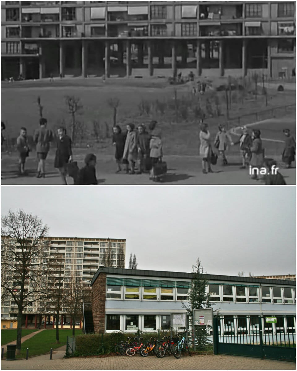 De part et d’autre de la rue, les écoles maternelle et primaire ont été construites en même temps que les immeubles, entre 1952 et 1955. Elles ont été pour parties rénovées et agrandies depuis. Ce qui frappe par ailleurs, c’est la « résidentialisation » progressive de l’espace. Originellement complètement ouvert, il est aujourd’hui fermé. Les écoles sont ceinturées de barrières, la rue à sens unique est passante et son passage, sécurisé. À noter que les écoles sont fréquentées par seulement 15% d’enfants habitant la Cité, dont la population est vieillissante. La zone de recrutement est par ailleurs très vaste et l’école propose des sections internationales.
