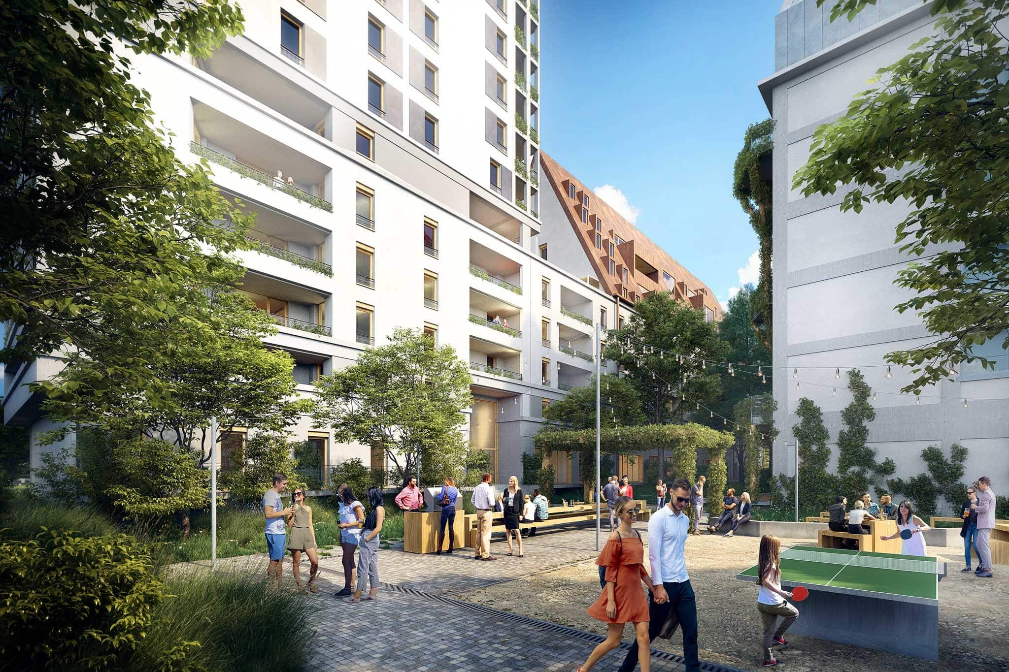 Les occupants de ces anciens bâtiments auront pour voisins les habitants du bâtiment neuf appelé « Entre2rives » (8 800 m²), avec un toit en pente et une tour à l’arrière, dont l’achèvement est prévu pour début 2022. La répartition des espaces est cette fois plus simple :