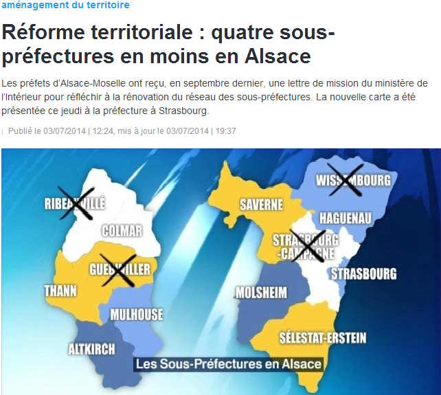 Jeudi, le préfet de région Stéphane Bouillon a annoncé la suppression de quatre sous-préfectures en Alsace, suite à une demande du ministre de l’Intérieur reçue en septembre 2013. Deux sous-préfectures disparaîtront respectivement dans le Bas-Rhin et le Haut-Rhin au 1er janvier 2015 et l’Alsace passera de 13 à 9 arrondissements. L’arrondissement de Wissembourg fusionne avec Haguenau, Guebwiller avec Thann, Ribeauvillé avec Colmar et les cantons de Strasbourg-campagne seront rattachés en partie aux arrondissements de Saverne et d’Haguenau.