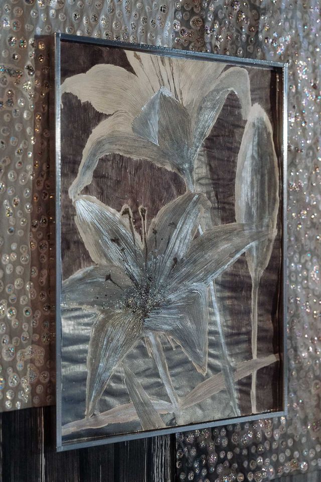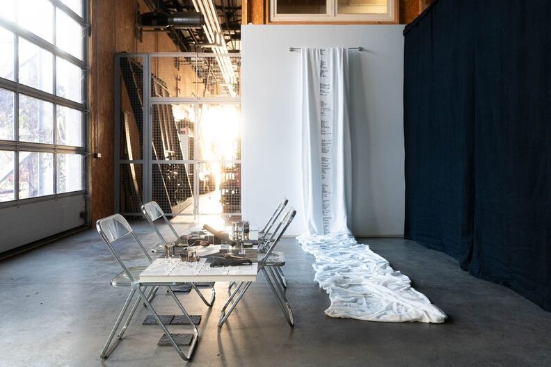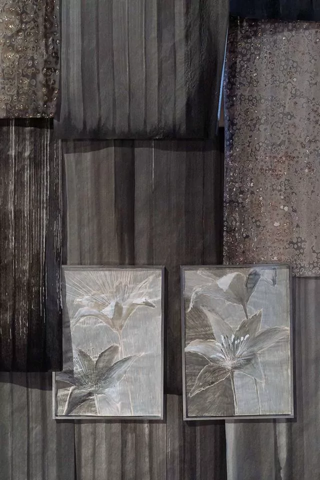 Dès le seuil, l’univers de Stanley Kubrick imprègne la pièce, en particulier avec le mur de dessins de Camille Fischer, dont la présence évoque les monolithes noirs de 2001, l’Odyssée de l’espace. Cette forêt graphique, à la fois scintillante et sombre, mêle nature luxuriante et urgence climatique. À côté, l’installation de Petra Keinhorst crée un contraste. Faite de sacs en paraffine blanche, elle figure une mer artificielle saturée de déchets plastiques.