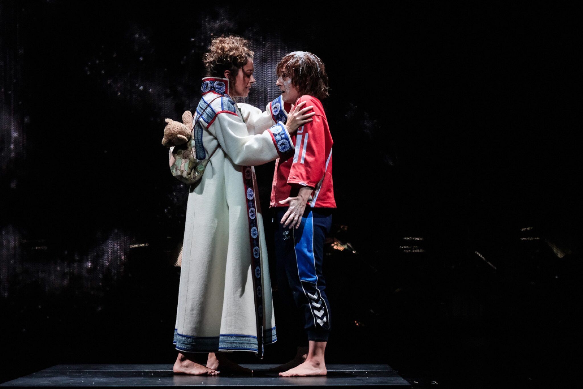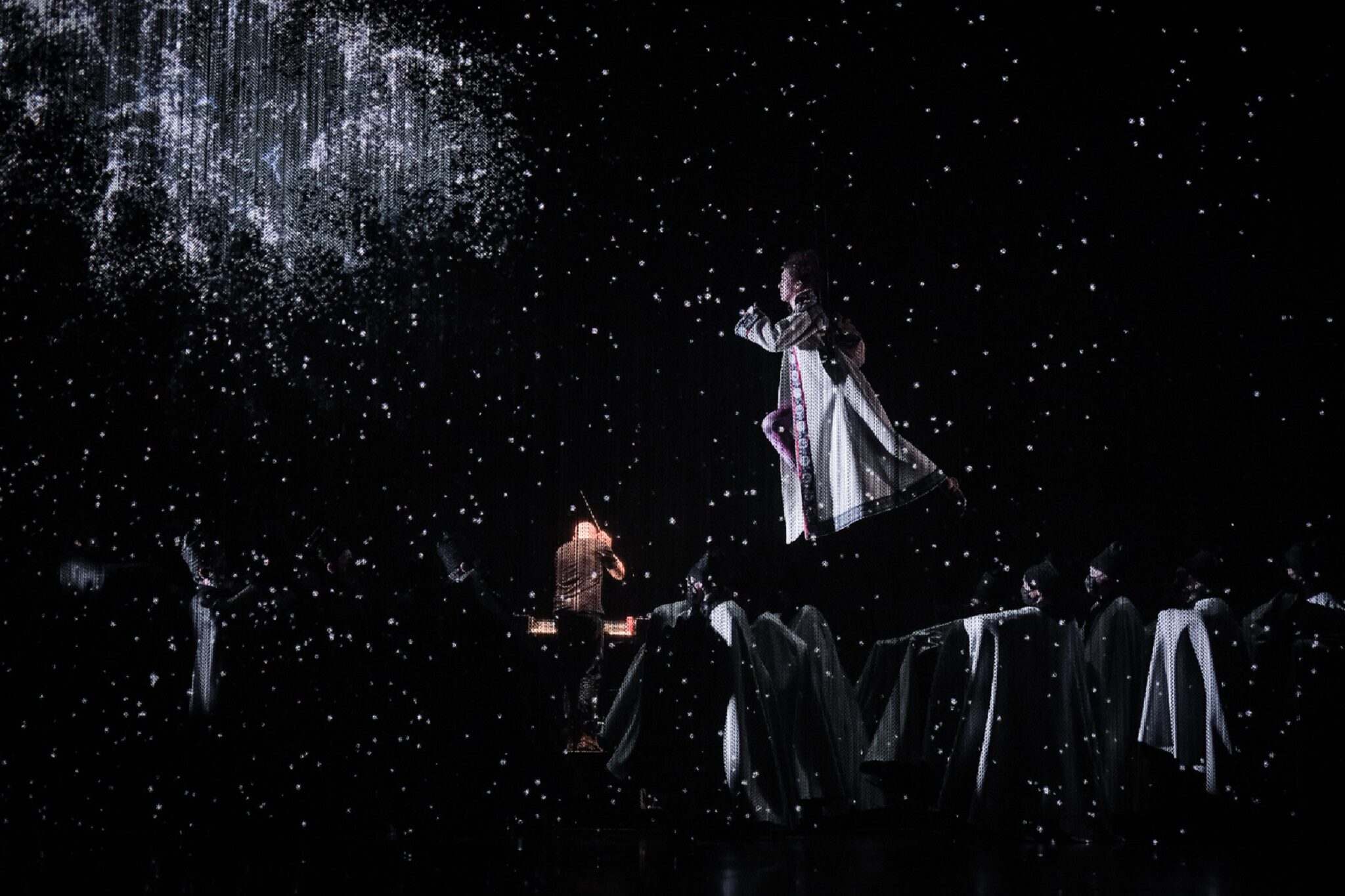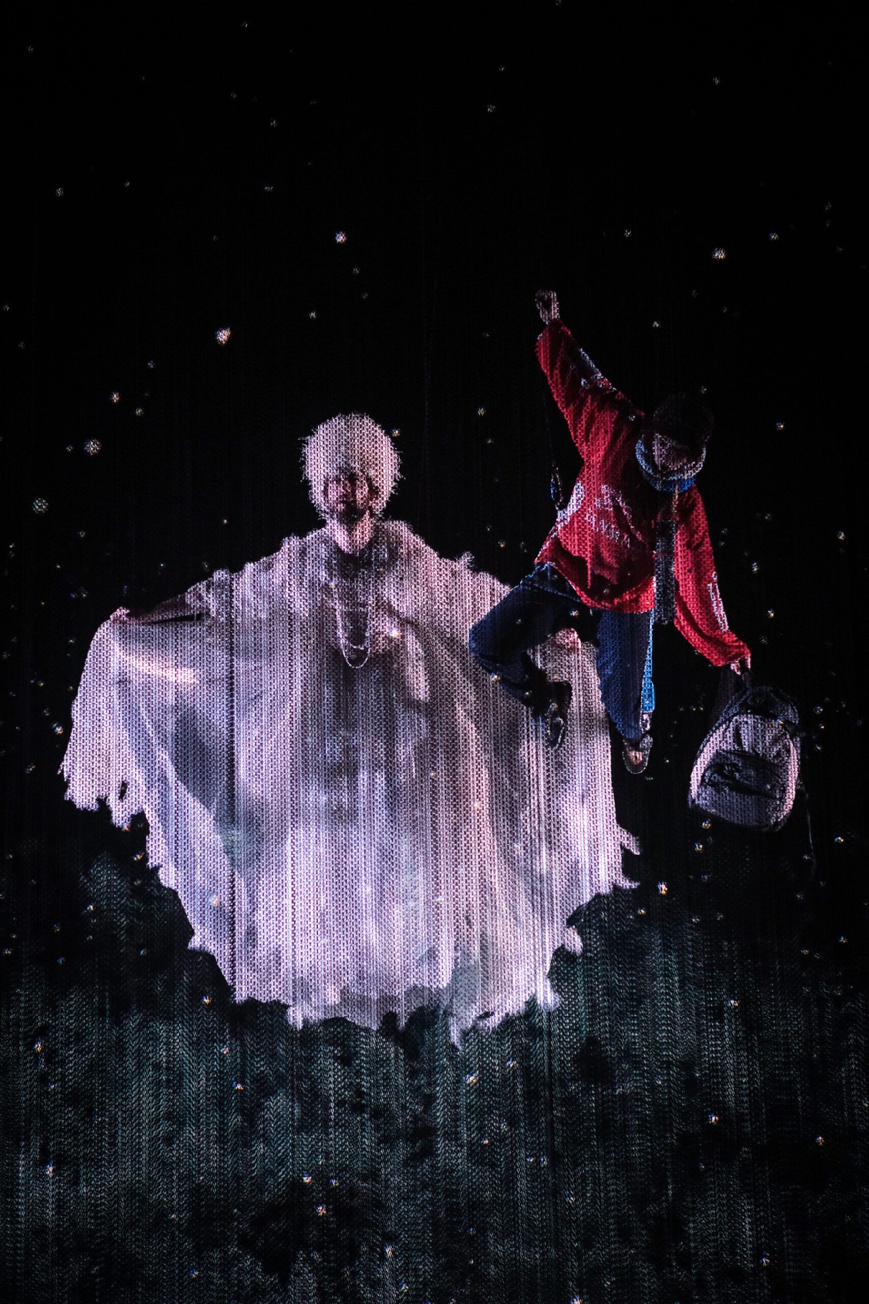 Le voyage de Gerda en traineau et son accident sont également très frappants, tant l’alliance des effets visuels et des mouvements en apesanteur de solistes suspendus par des câbles discrets fonctionne. La mobilité des projections permet un changement de décor rapide et marquant. Les tempêtes de neige, soutenues par une musique implacable, impactent directement les corps qui se débattent sur scène.