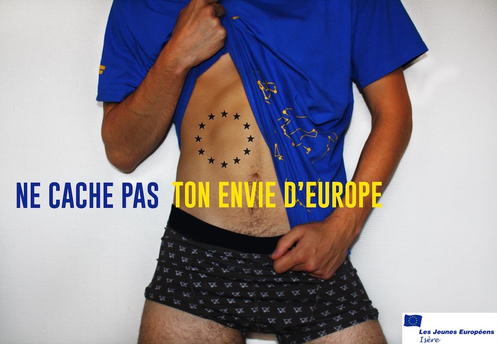 Comment motiver les jeunes d’aller voter aux élections européennes dimanche ? Les Jeunes Européens, en Isère, n’hésitent pas à faire appel au sexe (voir ci-dessus) : « Ne cache pas ton envie d’Europe » dit l’affiche, et déshabille toi, allez hop. La génération Erasmus est intenable mais cette démarche suffira-t-elle à améliorer les scores de participation des jeunes ? Pas sûr. Eurobaromètre prévoit un taux de participation entre 30 et 40% chez les moins de 30 ans (PDF)…
