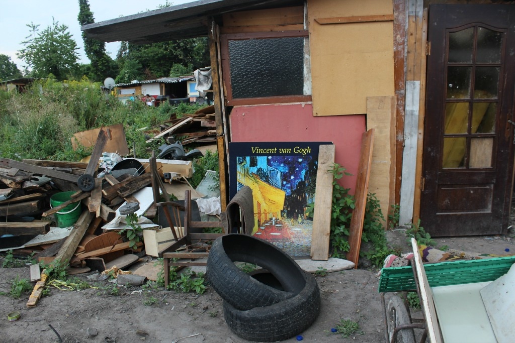 Visuellement, c’est le choc. Des « maisonnettes » construites avec des morceaux d’armoires, des portes de douche, des cartons, et tout ce qu’on a pu trouver, composent ce « village ». A Saint-Gall, l’air est empli de poussière. Les sols se transforment en boue en automne et en hiver. Pas un seul arbre, mais une sorte de mélange de hautes herbes, d’orties et de détritus en tous genres, y constituent les « espaces verts ». Pneus, morceaux de bois, vestiges de ce qui a servi à construire les cabanes, le paysage est chaotique. Un poster représentant le tableau « Terrasse du café le soir » de Vincent Van Gogh, est posé contre le mur fragile d’un de ces abris de fortune, derrière une pile de pneus.