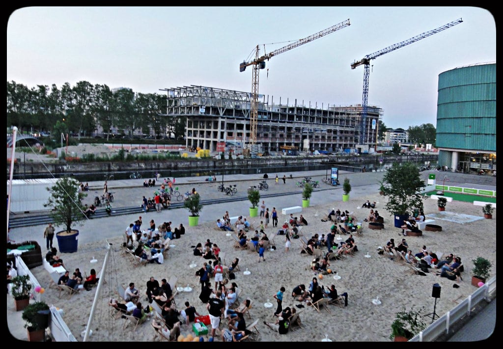 Et pour faire la fête, Alsace Digitale n’a pas lésiné sur les moyens. Du sable devant la Médiathèque, des transats et des parasols pour le décor, d’énormes bouées oranges, un bar (mais sans alcool) tenu par les Brainstormers, Panimix à la sono et AV Exciter aux lumières… Le gros rendez-vous, ce sera vendredi soir lors de la « EdgeNight » à partir de 19h avec entre autres une projection graphique de Vincent Godeau et Vincent Broquaire sur la façade du Shadok et du rétro-gaming géant sur la façade de la médiathèque, projeté depuis La Plage Digitale, où se situent les locaux de Rue89 Strasbourg, en face. L’Ososphère n’a qu’à bien se tenir !