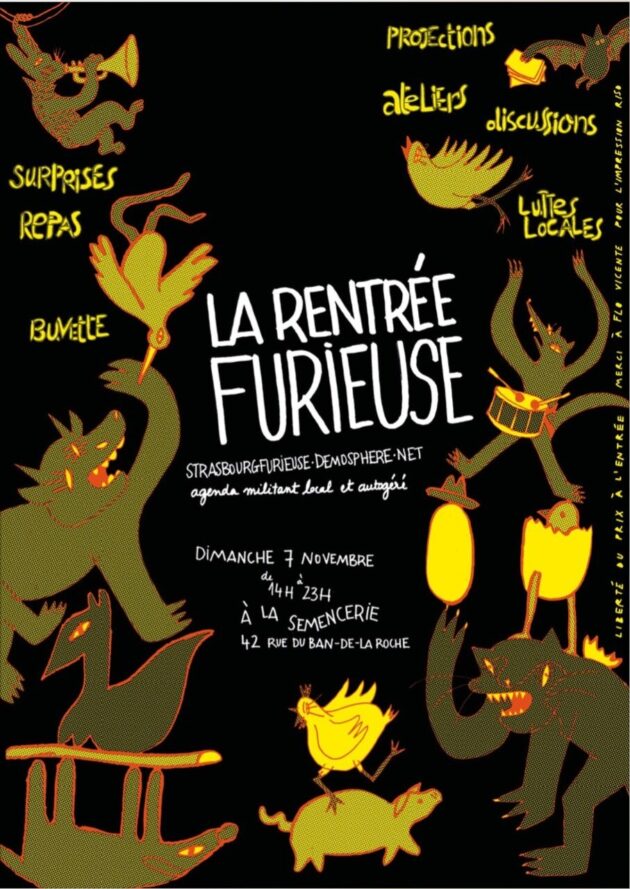 Mis en ligne depuis 2013, l’agenda Strasbourg Furieuse bénéficie depuis 2019 d’une équipe de bénévoles motivées pour publier chaque jour les rendez-vous militants à Strasbourg et autour. Afin de retrouver un peu de convivialité après une période pandémique particulièrement sèche en mobilisations, l’équipe organise la « Rentrée furieuse », une série de rencontres dans l’après-midi et la soirée du dimanche 7 novembre, à la Semencerie dans le quartier Laiterie.