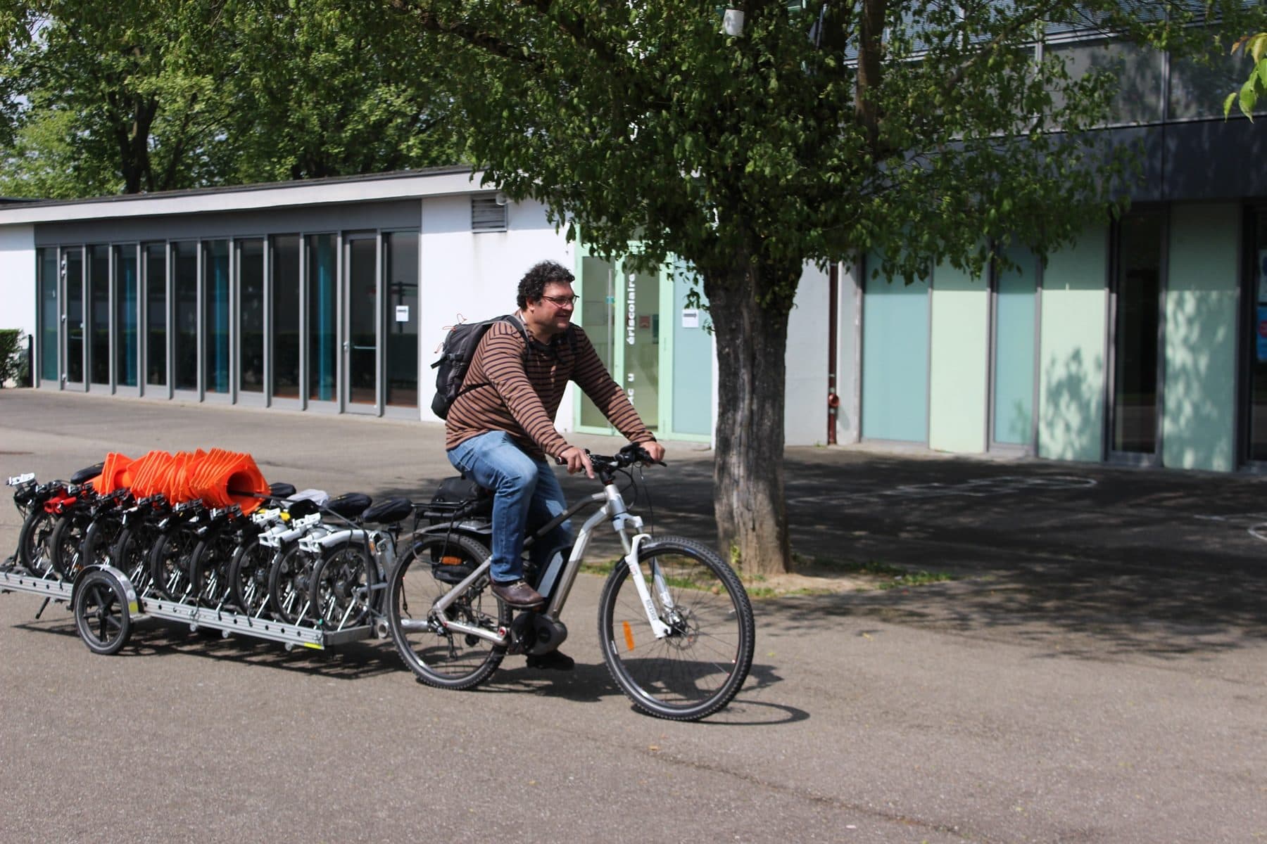 Après chaque séance, Vincent Murez ramène à la force de ses mollets (et de l’assistance électrique) les 9 vélos pliables aux locaux du Cadr, rue des Bouchers (photo JFG / Rue89 Strasbourg)