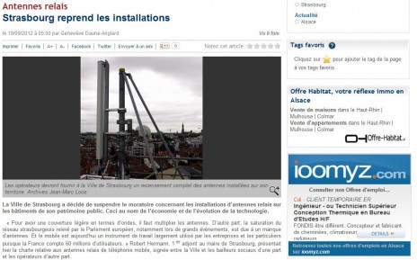 L’installation d’antennes relais va reprendre à Strasbourg, la ville a décidé de suspendre le moratoire sur celles-ci. Robert Herrmann, 1er adjoint au maire de Strasbourg, a expliqué que la ville devait installer de nouvelles antennes pour éviter la saturation du réseaux notamment lors de grands évènements et que leur multiplication permettrait d’émettre des ondes moins fortes.