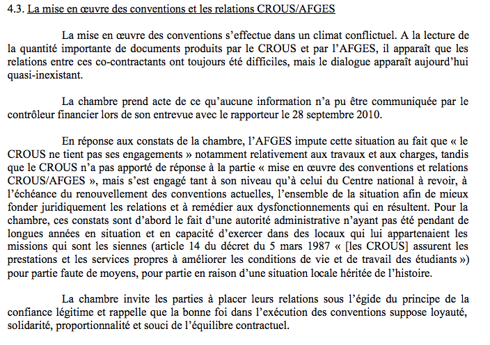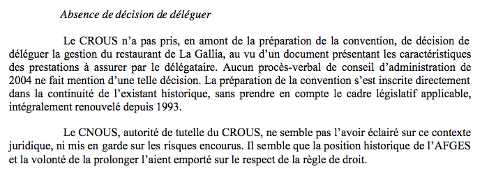 Pour la Chambre, la relation qui lie le Crous et l’Afges s’apparente à une délégation de service (DSP), ce qui supposerait un appel d’offres alternatives (mise en concurrence de l’Afges) et la transparence des comptes.