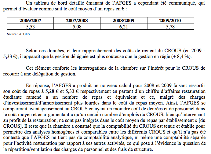 Or, le rapport pointe de nombreux problèmes, et notamment une absence de « comptabilité analytique » par l’association, « qui permettrait de dégager le prix de revient d’un repas ». Les seuls éléments en possession de la Chambre lui permettent d’écrire que les repas servis par le Crous reviendraient moins chers que ceux servis par l’Afges à la Gallia.