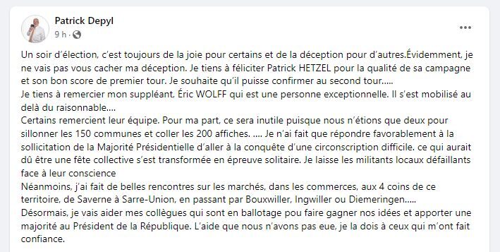 Dans cette circonscription très à droite, le député sortant Patrick Hetzel est bien parti pour garder son siège et sauver l’honneur de « Les Républicains » en Alsace. Il est en tête avec 35% des voix et sera opposé à Valérie Eschenmann (21,31%) du RN. L’ancien maire de la Wantzenau, Patrick Depyl (Modem) est éliminé. Sur Facebook, il a fustigé les militants des partis de la coalition « Ensemble ! » qui d’après lui l’ont laissé seul avec son suppléant pour faire campagne dans ce secteur difficile pour la majorité présidentielle, sans candidat implanté.