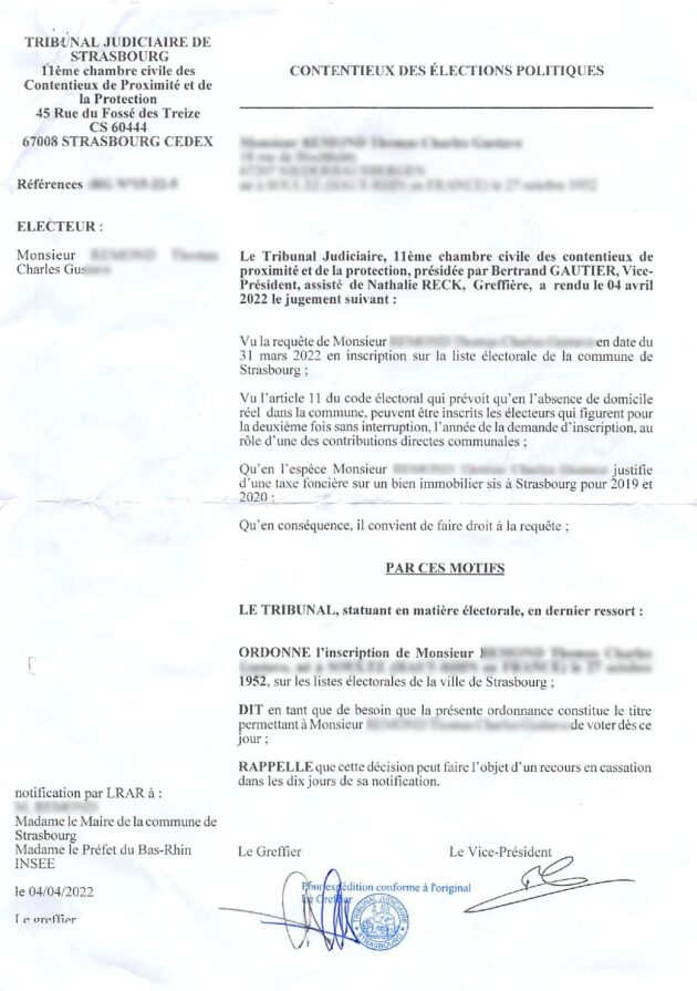 Avec ces éléments, l’électeur doit se rendre ensuite au tribunal judiciaire (45 rue du Fossé-des-Treize), où une permanence est également prévue. En cas d’erreur de l’administration, le juge peut ordonner une réintégration d’office, dans le cas d’un oubli des démarches de la part de l’électeur, une décision de réintégration est peu probable…