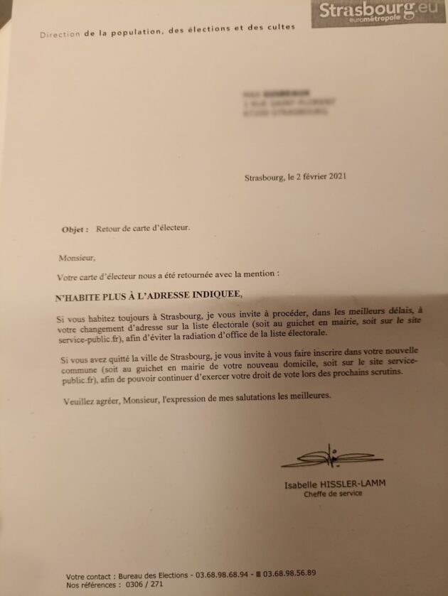 Dans le cas d’une radiation, l’électeur strasbourgeois doit se rendre au centre administratif (place de l’Étoile) pour faire constater la radiation, une permanence avec une demi-douzaine d’agents est prévue. Le service administratif explique alors à l’électeur ce qu’il s’est passé, lui remet le retour des courriers envoyés, etc. S’il n’y a pas eu de déménagement, le service doit remettre une « attestation d’erreur matérielle. »