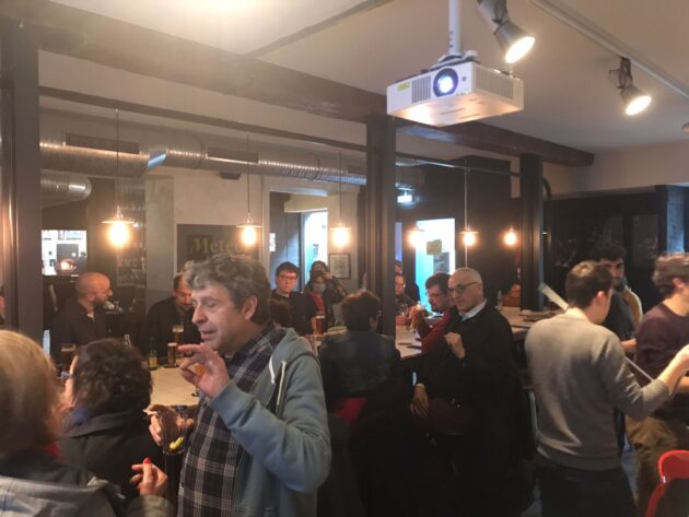 Une trentaine de personnes sont réunies à la brasserie Meteor pour suivre les résultats avec les militants de la France insoumise.