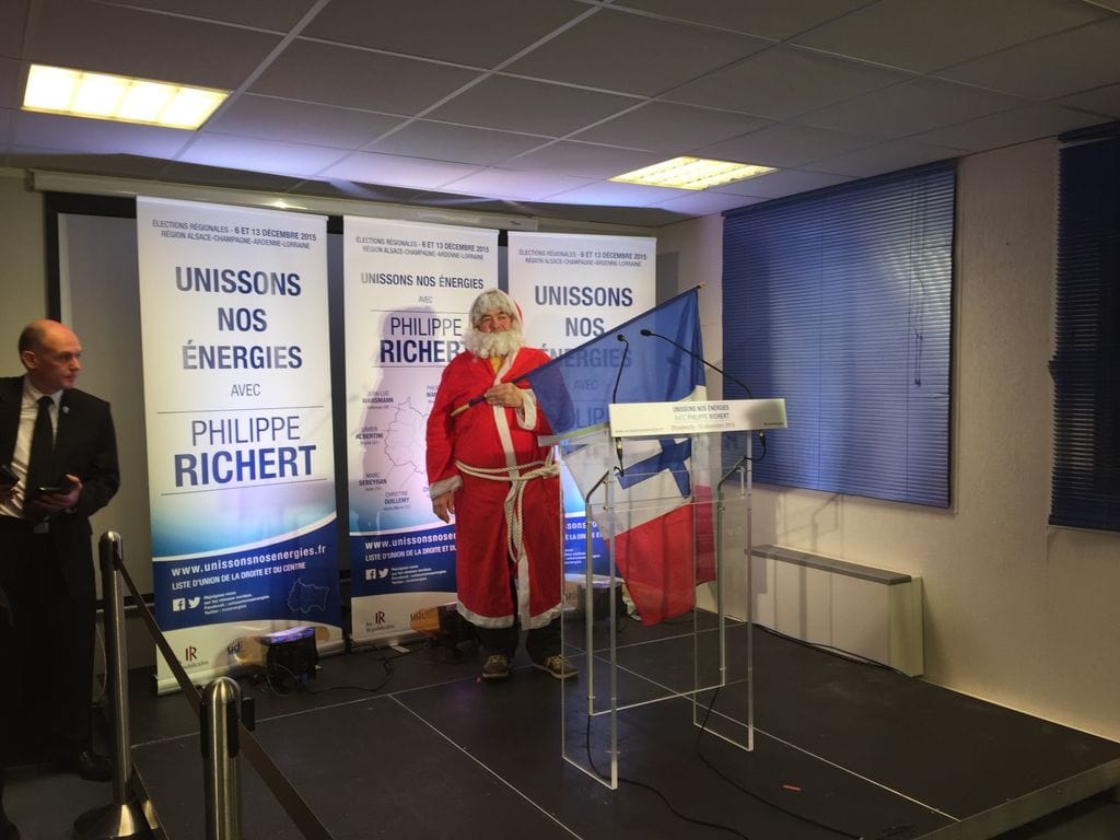 #ACAL2015 au QG de Richert un militant se balade déguisé en Père Noël avec un drapeau tricolore