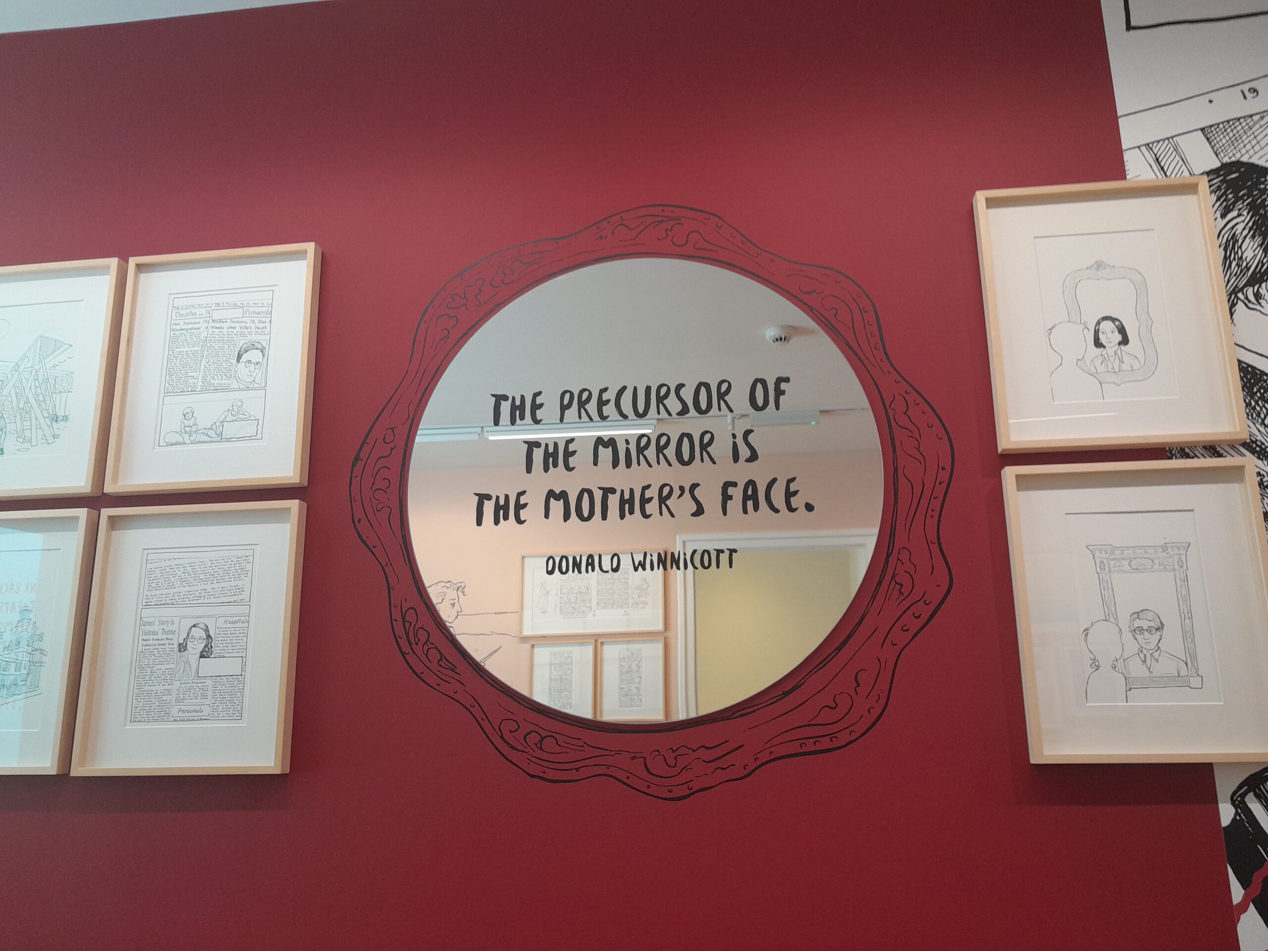 À l’étage dans une pièce complètement rouge, ce sont des crayonnés, des planches originales mais aussi des aquarelles de « C’est toi ma maman ? » qui sont exposées. Dans ce roman graphique paru en 2012, elle questionne ses relations avec sa mère. Sur un mur, un miroir barré d’une citation de Donald Winicott : « Le précurseur du miroir est le visage d’une mère » pose les bases de la réflexion que l’auteure va développer tout au long de la BD.