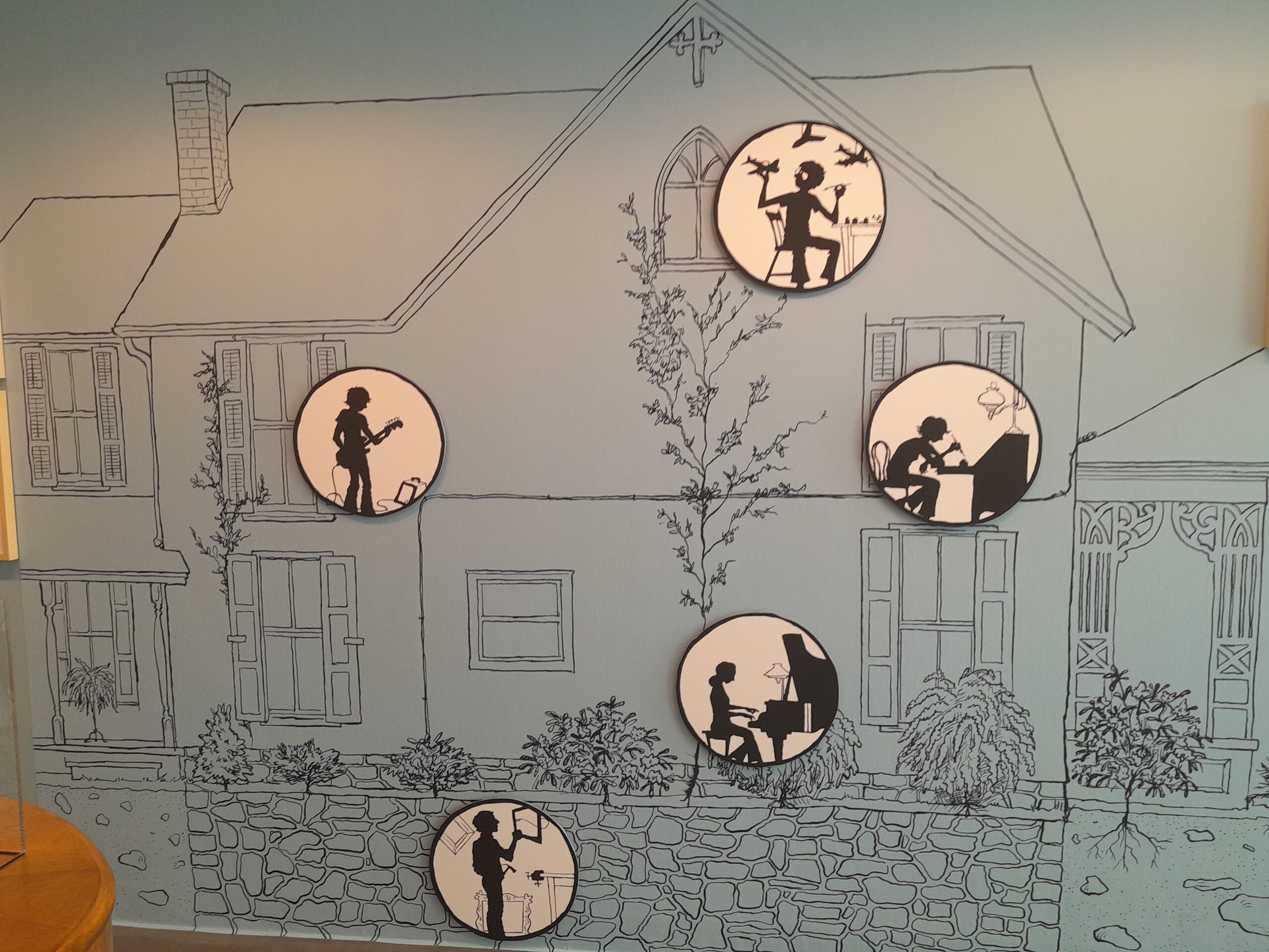 Une autre salle, intégralement bleue, est consacrée à « Fun home – une tragicomédie familiale », le best-seller qui lui a valu le prix Eisner en 2007 (la plus haute distinction américaine en BD) et lui assuré une visibilité internationale. Elle y dévoile son enfance, son père secrètement bisexuel, au un goût imparable en matière de décoration d’intérieur, à la fois professeur d’anglais et embaumeur. Sur les murs au trait noir fin est dessinée… la représentation de la maison d’Alison Bechdel.