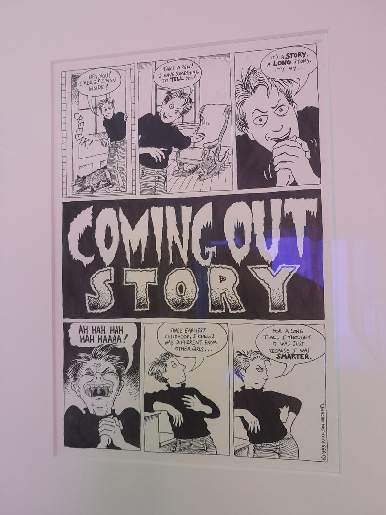 Dans une toute petite salle, volontairement laissée blanche cette fois-ci, ce sont des planches de sa « Coming out story » que le visiteur peut lire. Le titre est écrit dans la même police que celle utilisée pour annoncer les films et livres d’horreur des années 70. Pleine d’humour, l’œuvre de Bechdel est à ses débuts intégralement en noir et blanc.