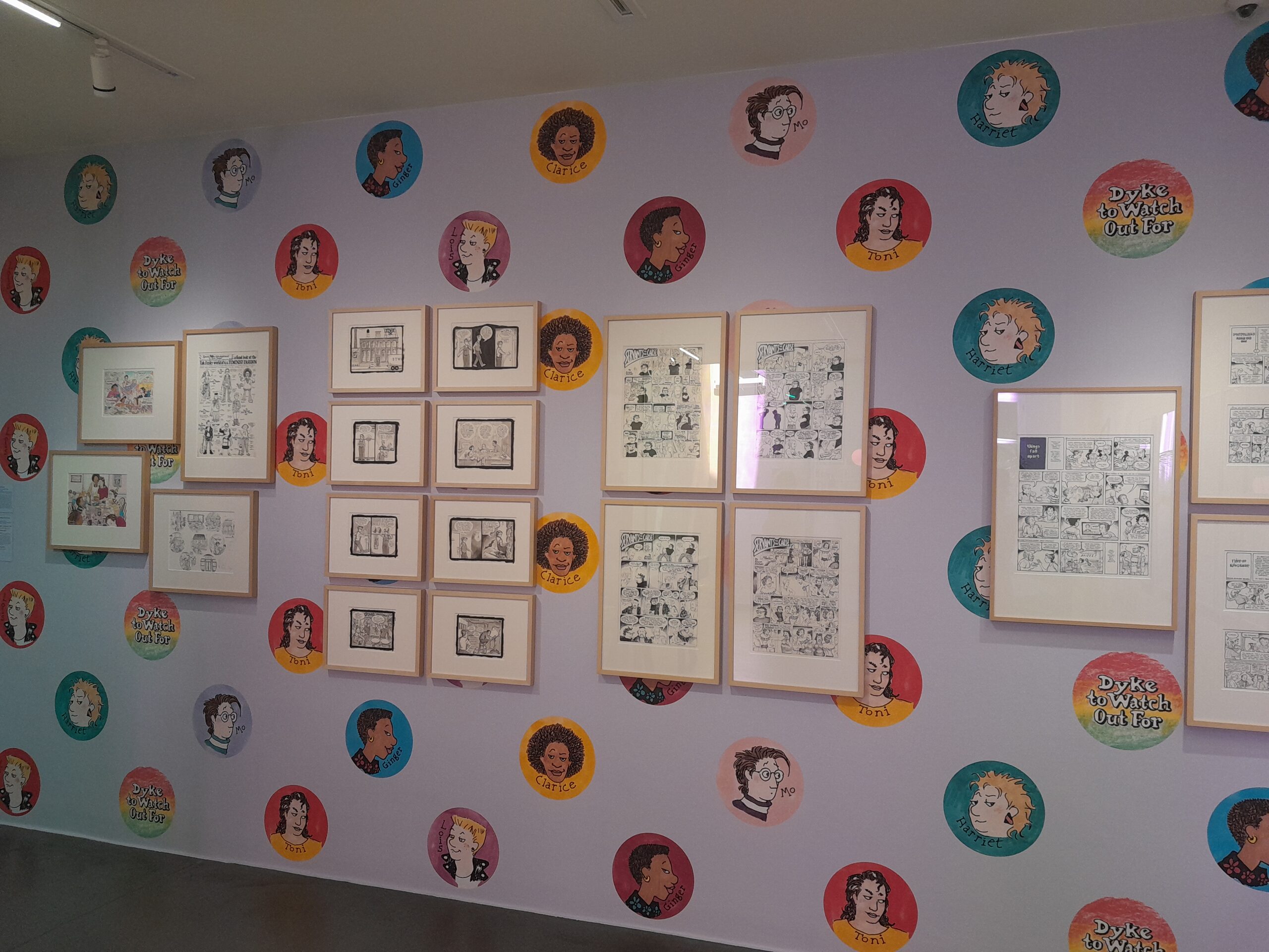 Le musée a fait le choix de présenter une oeuvre par pièce et chaque pièce a une couleur différente. L’exposition commence au rez-de-chaussée, dans une salle dont le mur du fond est couleur Lila. Sur ce même mur comme autant de portraits de familles sont présentées les protagonistes de « Lesbiennes à suivre ». Dans cette série, à laquelle Alison Bechdel a mis un coup de crayon final en 2008, elle raconte les aventures d’une bande de copines lesbiennes dans une ville moyenne des États-Unis.