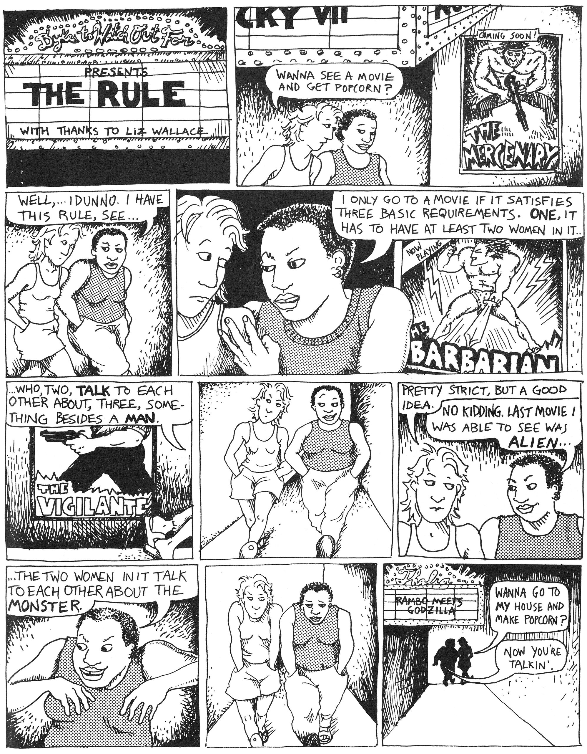C’est dans cette BD, résolument queer et militante qu’est évoqué pour la première fois le « test » mettant en évidence la surreprésentation des protagonistes masculins dans les oeuvres de fiction. Dans cette série, un personnage explique que pour qu’un film ne soit pas sexiste, il faut qu’il réponde à trois critères : au moins deux personnages féminins, qui parlent entre elles d’autre chose que d’un homme. Le test de « Bechdel » était né.