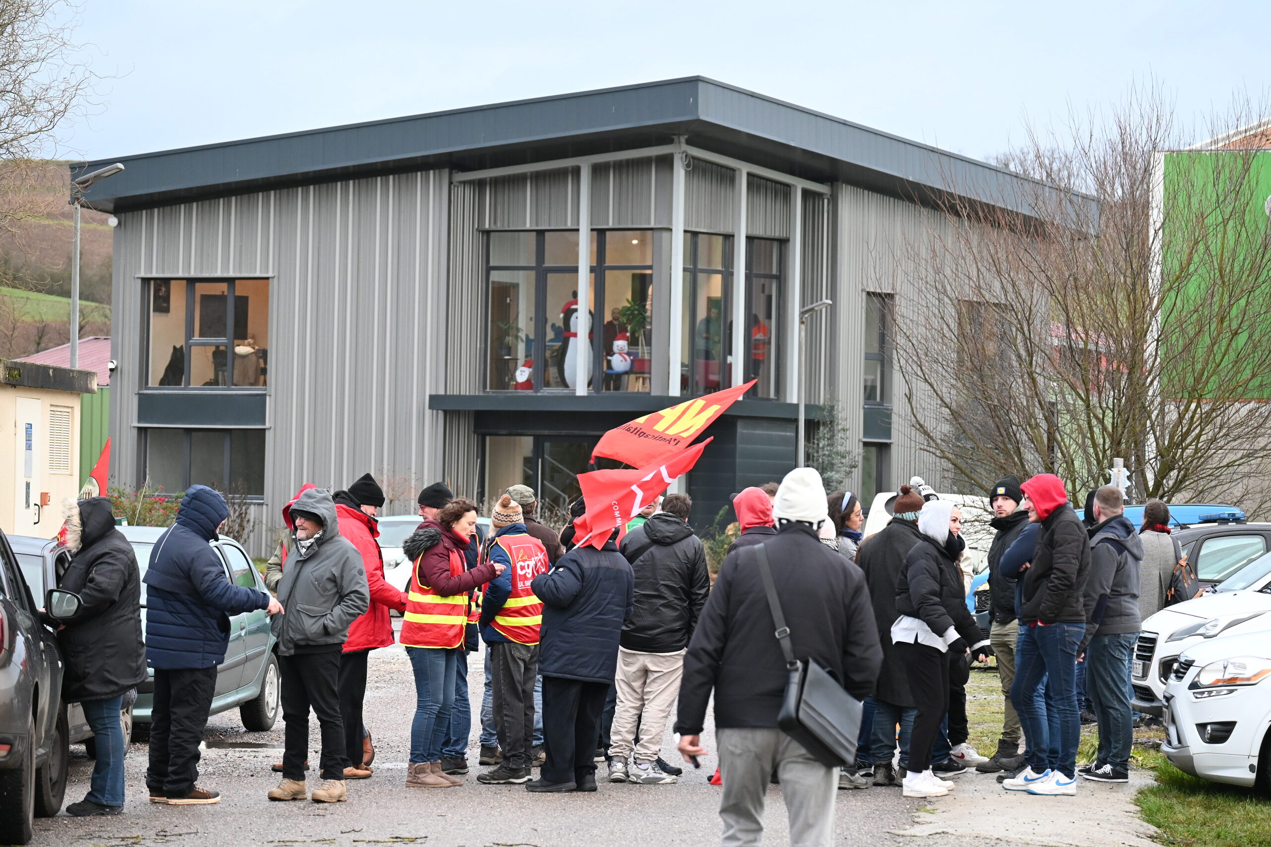 Le vent glacial des collines sous-vosgiennes souffle sur les drapeaux rouges floqués CGT, NPA et PCF à l’entrée de la commune de Rohr dans le Kochersberg. Lundi 23 décembre, une vingtaine de personnes sont rassemblées aux portes de Ritleng Revalorisations, une entreprise de recyclage de plâtre, en activité depuis 2012. Stationnés dans leur fourgon, sept gendarmes surveillent le petit groupe. Frédéric Karas, secrétaire adjoint de l’union locale CGT de Saverne, n’y prête même plus attention : « C’est toujours comme ça. On arrive rarement à rencontrer les patrons. Mais on est toujours accueilli par la gendarmerie ».