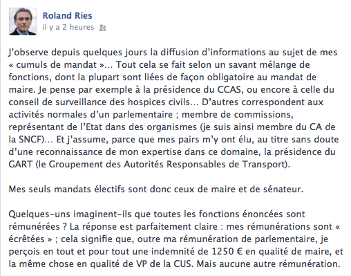 Depuis quelques semaines, le profil Facebook du maire de Strasbourg s’anime. Outil de campagne en vue des municipales de l’année prochaine ? Peut-être. Canal pour faire passer des messages politiques à ses nombreux « amis » ? Plus sûrement, dans l’immédiat. Ce dimanche, Roland Ries répond aux attaques dont il fait l’objet concernant son cumul de mandats et de fonctions :