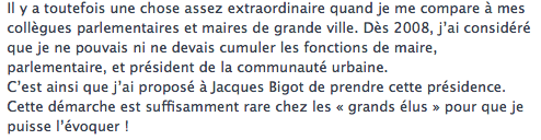 « Quand je me compare, je me console », dit-il en substance. Il aurait pu faire pire, comme d’autres « grands élus » ailleurs, mais Roland Ries a « considéré [qu’il] ne pouvait, ni ne devait cumuler les fonctions de maire, parlementaire et président de la communauté urbaine ». Les mauvaises langues feront valoir que le même Roland Ries a bel et bien cumulé ces fonctions entre 1997 et 2000, alors qu’il remplaçait Catherine Trautmann à la tête de Strasbourg. Mais qu’après 7 ans de Tandem (2001-2008) et sa répartition des rôles entre CUS (Robert Grossmann) et Ville (Fabienne Keller), il aurait été malhabile pour lui de se réapproprier ces deux fonctions…