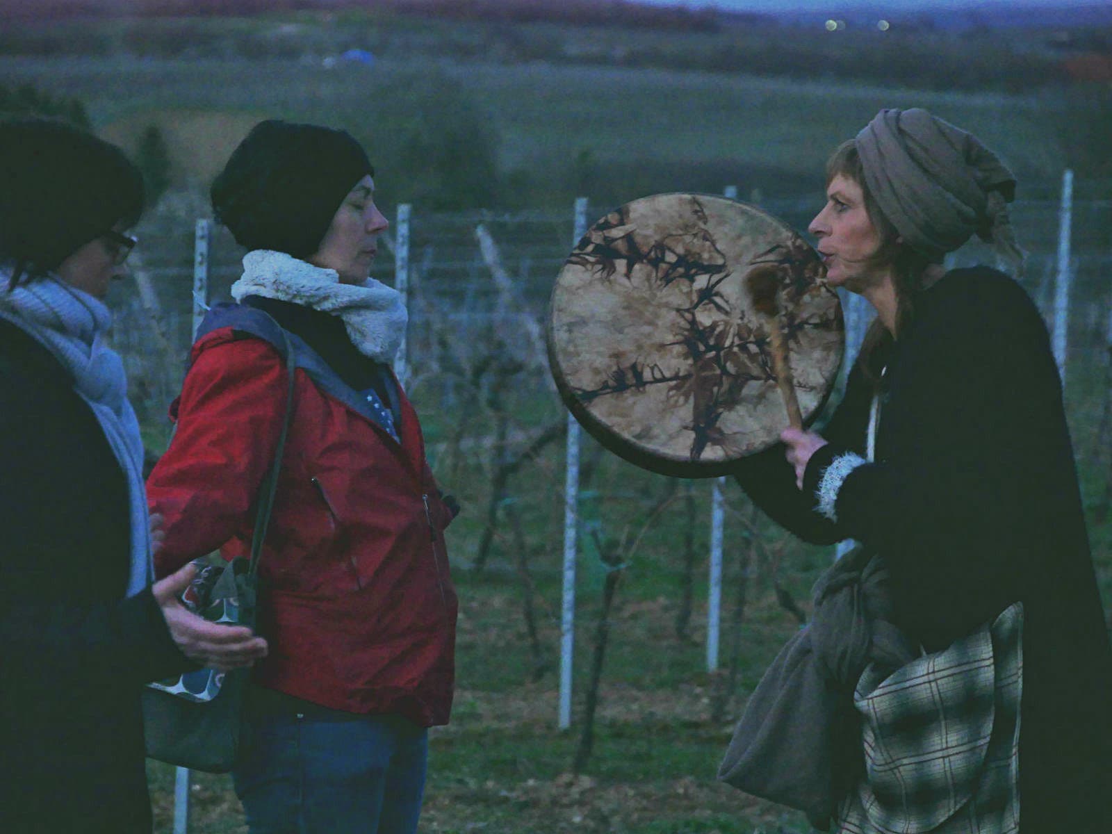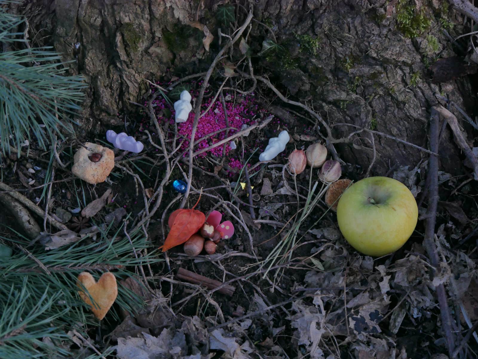 Pendant que la guérisseuse s’adresse aux esprits des lieux, le groupe attend patiemment. En silence, ils restent souvent immobiles, les yeux fermés, les bras écartés. Lorsque la chamane a terminé, les participants s’approchent de l’arbre et déposent des « offrandes » : une pomme, des graines, un petit Jésus en meringue, des fleurs…