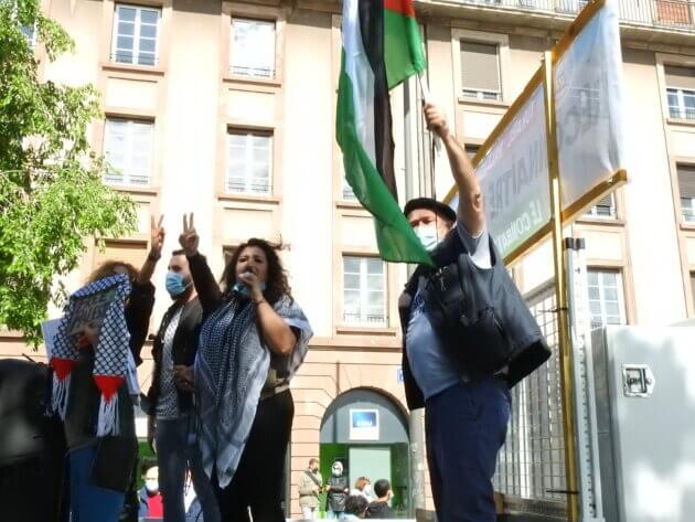 Sur place, quelques jours après, alors même que l’AFPS et le CJACP (Collectif Judéo Arabe et Citoyen pour la Palestine) ne l’ont jamais vue mais seulement entendue par téléphone, la militante se fait reconnaître. Elle n’a pourtant rien sur elle qui puisse dévoiler que c’est bien elle qui est à l’initiative du mouvement. Spontanée, elle s’empare du mégaphone et se dresse devant la foule pour crier : « Attendez ! » « Il était trop tôt pour démarrer la marche, le monde continuait d’arriver », justifie-t-elle. Puis elle improvise : « Enfants de Gaza, c’est l’humanité qu’on assassine ! »