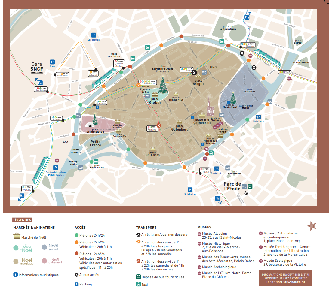 Pendant toute la durée du Marché de Noël, une zone à réglementation particulière est instaurée avec comme première conséquence l’interdiction de circulation de tous les véhicules dans l’enceinte de la Grande-Île, les lundis, mardis, mercredis, jeudis et dimanches de 11h à 20h, les vendredis de 11h à 21h, les samedis de 11h à 22h du vendredi 23 novembre au lundi 24 décembre, 18h. Ces dispositions sont étendues jusqu’au 30 décembre pour les chalets de la place de la Cathédrale et alentours.