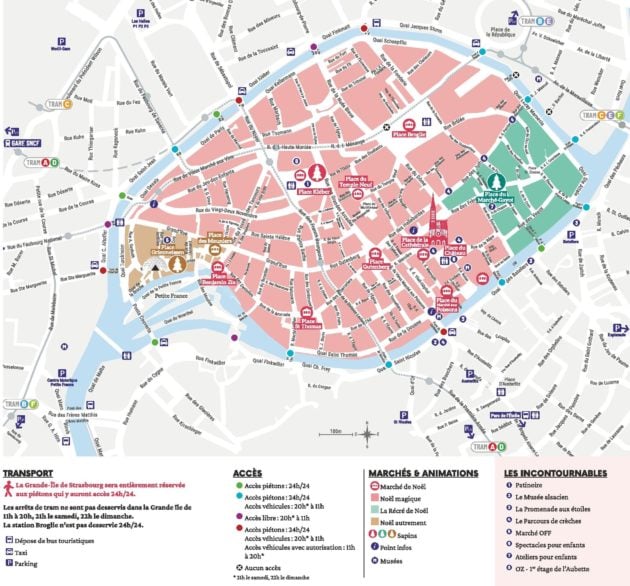 L’accès à la Grande île de Strasbourg sera encore restreint cette année. Seuls 16 ponts seront ouverts du 22 novembre au 24 décembre (contre 19 habituellement). Le pont de la rue du Faubourg-National et celui de la rue du Faubourg-de-Pierre seront fermés pendant toute la durée du marché, ainsi que la passerelle des Moulins. Comme lors des éditions précédentes, les passerelles des Juifs et des Faux remparts seront bloquées.