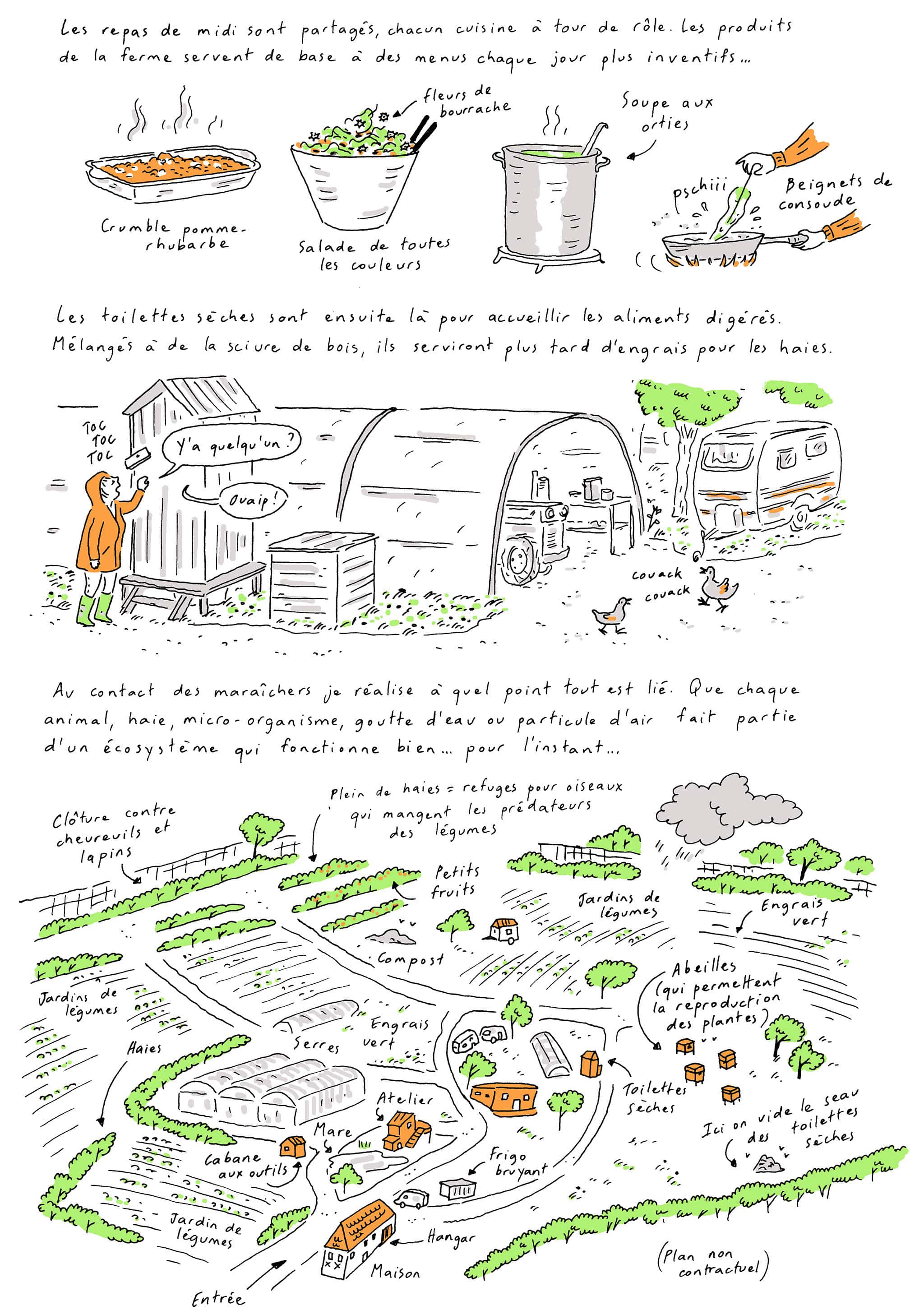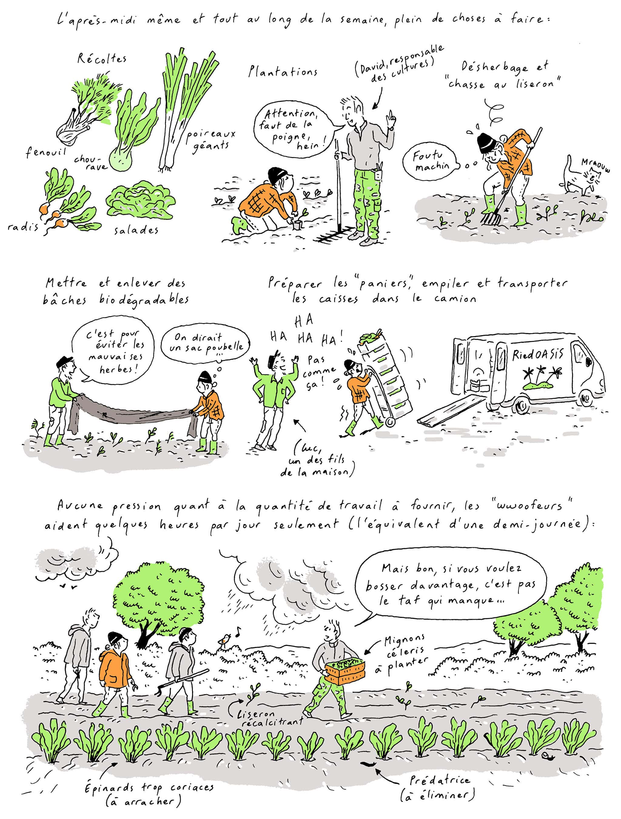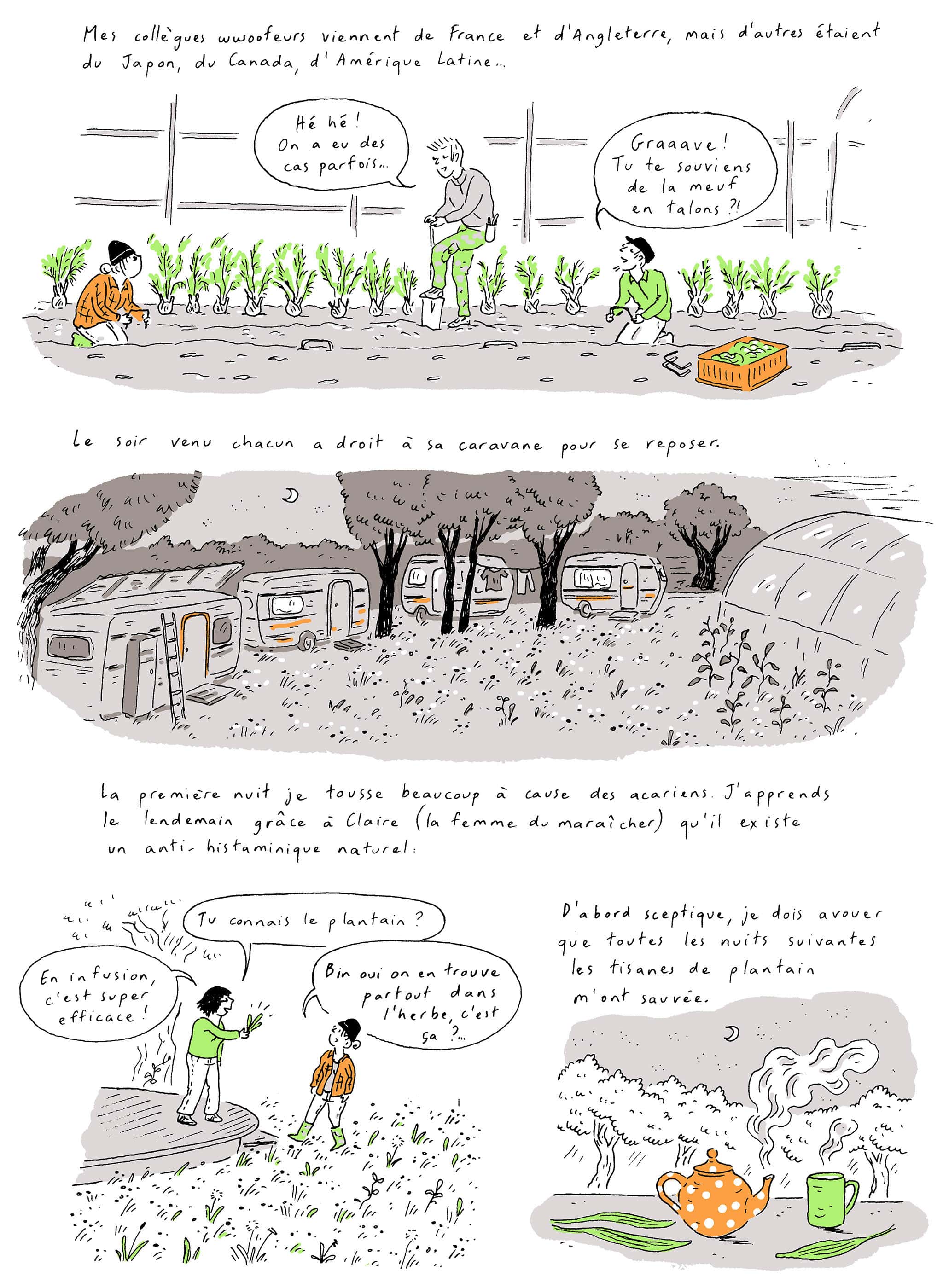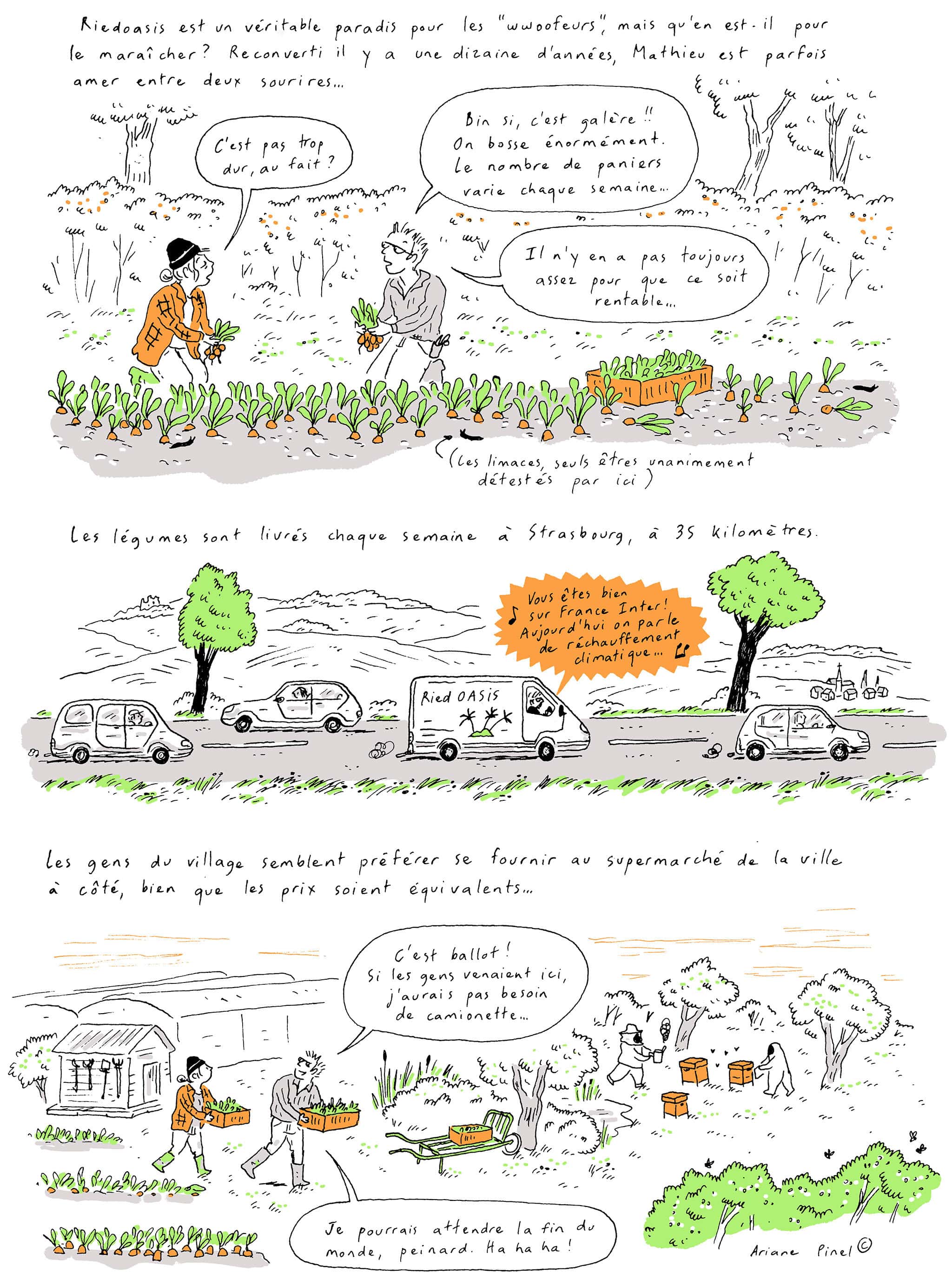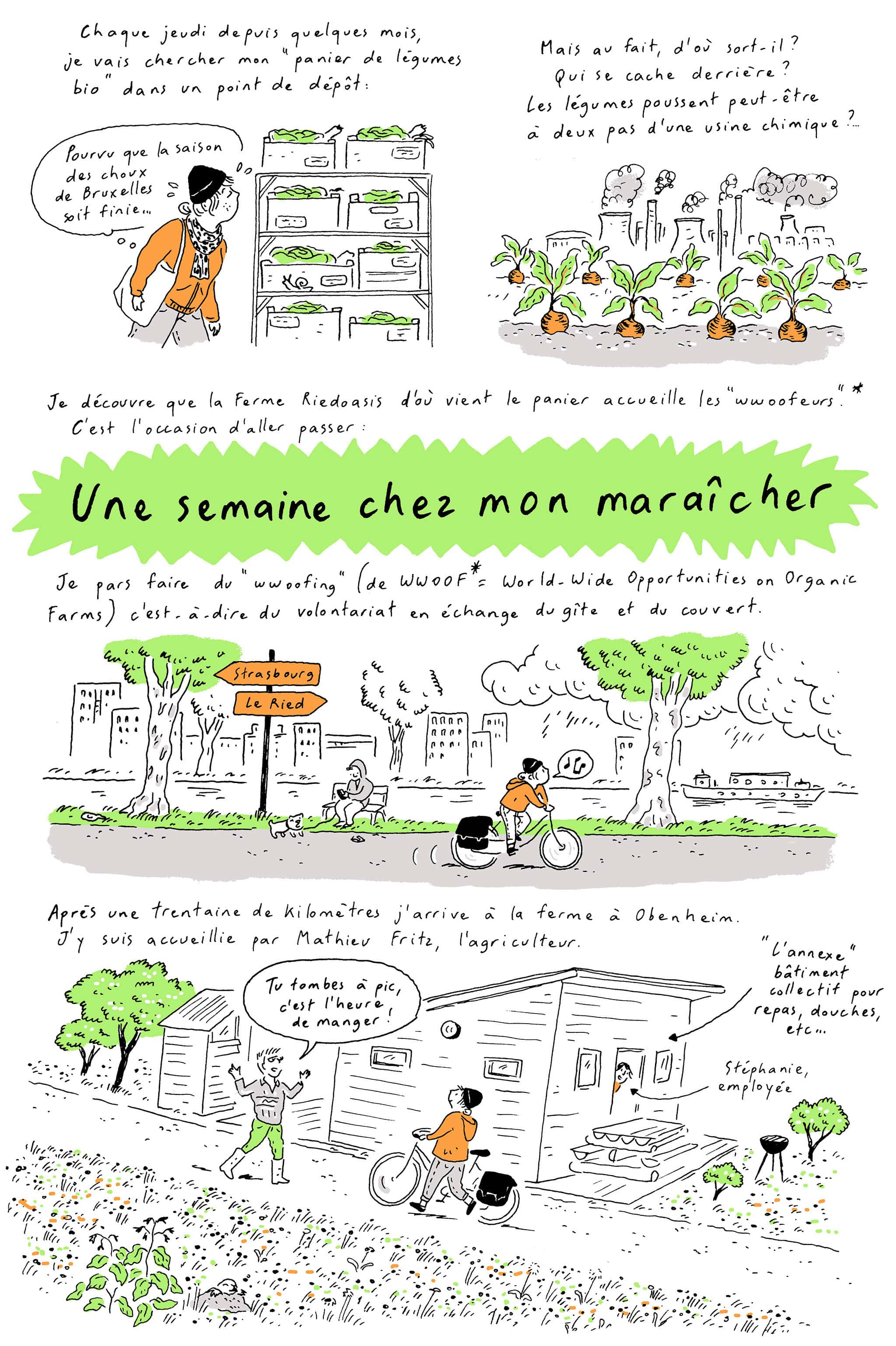 Chaque jeudi je cherche mon « panier de légumes bio » près de chez moi, livré par la ferme RiedOasis. J’ai eu envie de savoir d’où venaient ces produits, comment ils étaient cultivés et par qui. Je suis partie mener l’enquête en « WWOOFing » (aide à la ferme contre hébergement et repas) à Obenheim. Reportage en bande-dessinée.