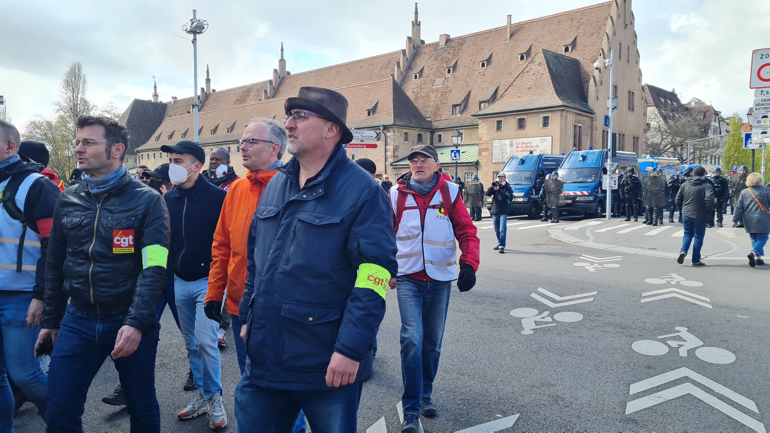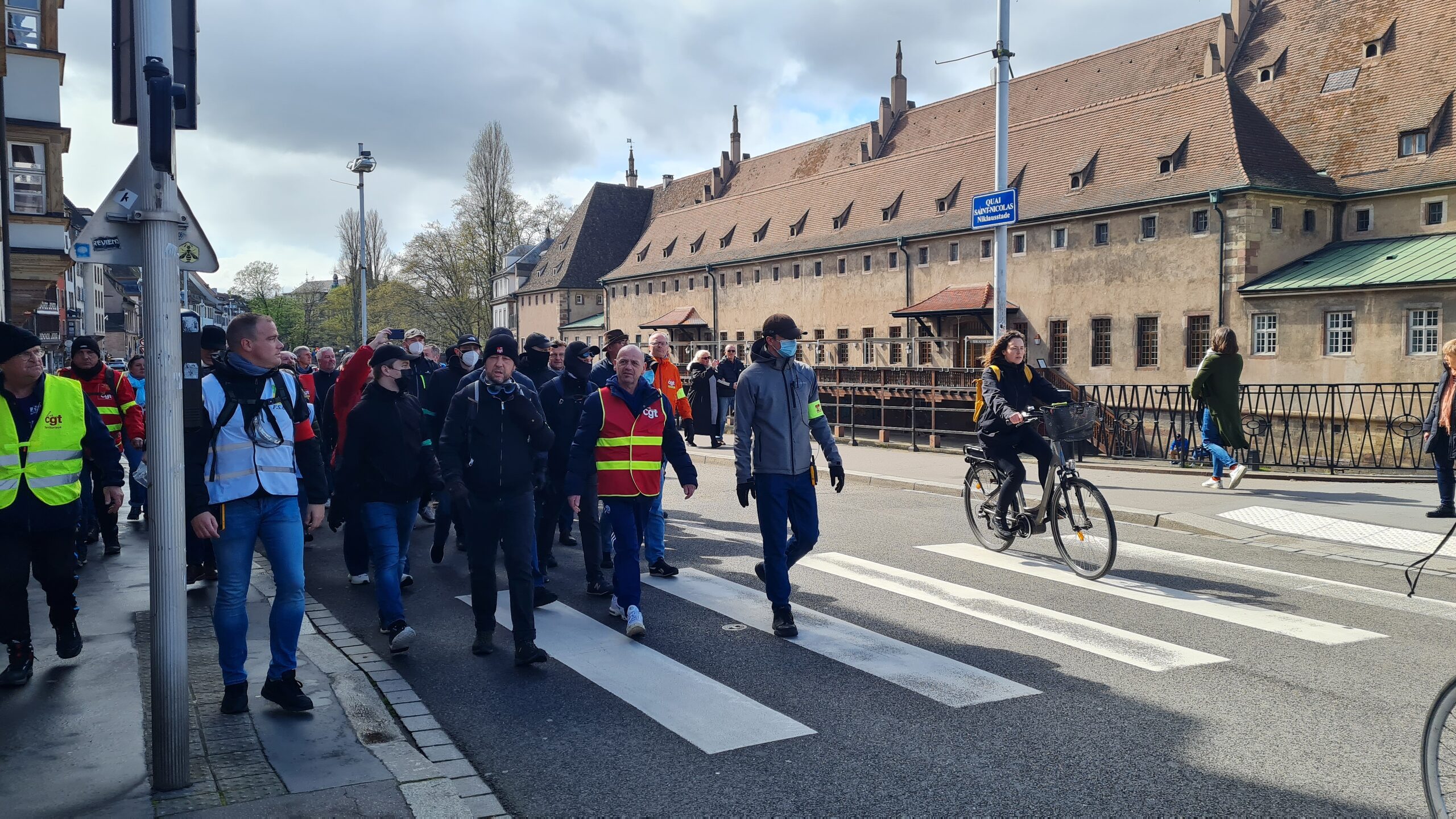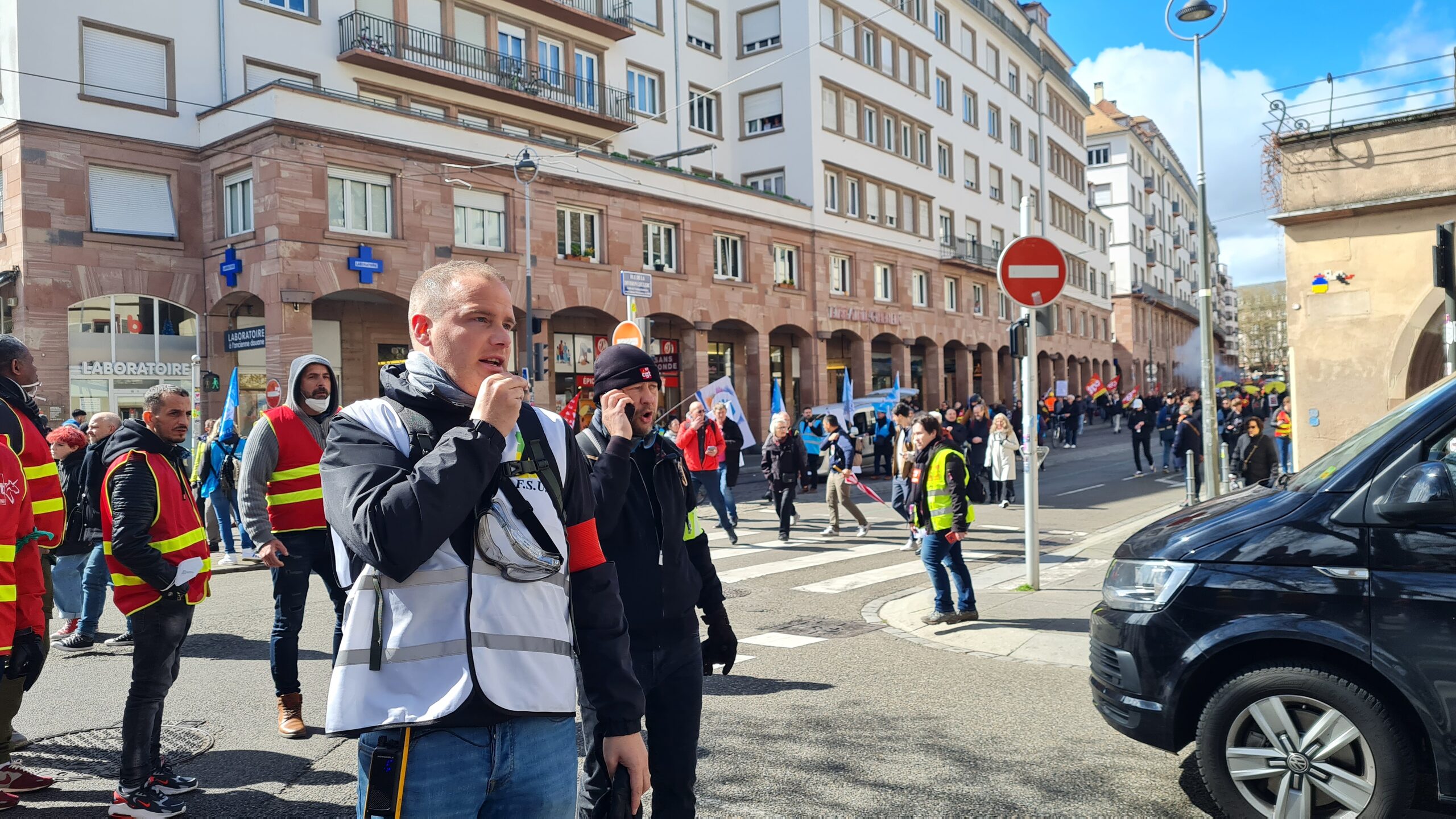13h30, jeudi 13 avril. À une demi-heure du début de la manifestation intersyndicale, Gilles Dimnet briefe les services d’ordres syndicaux sur le parvis du Palais du Rhin. « Vous savez que c’était tendu la semaine dernière. Ceux qui ont des marbrures sur les cuisses s’en souviennent », entame le responsable du service d’ordre (SO) de la CGT, par ailleurs secrétaire général adjoint de la CGT Eurométropole :