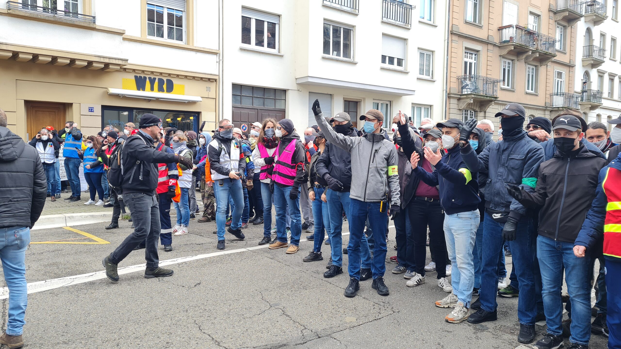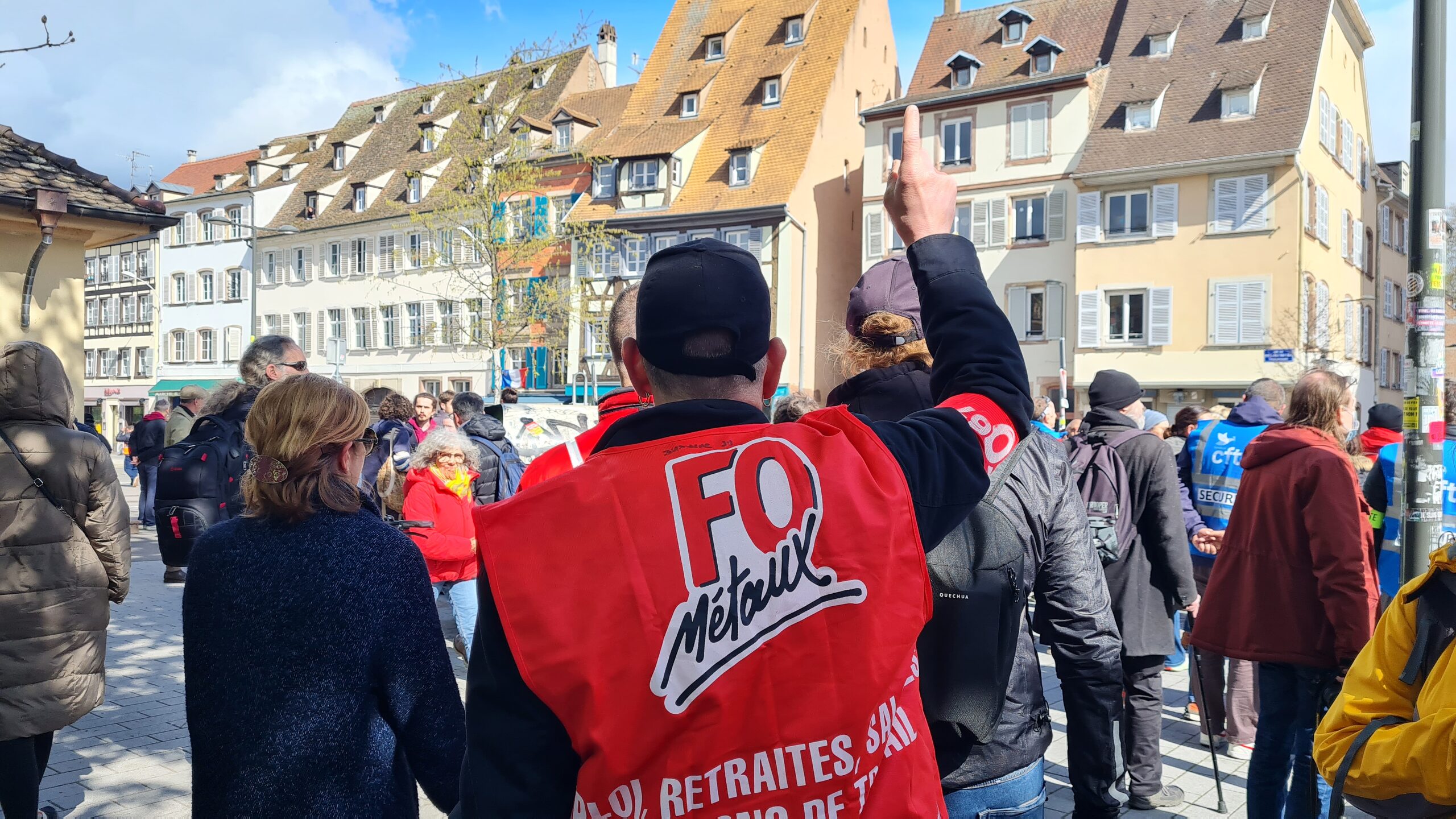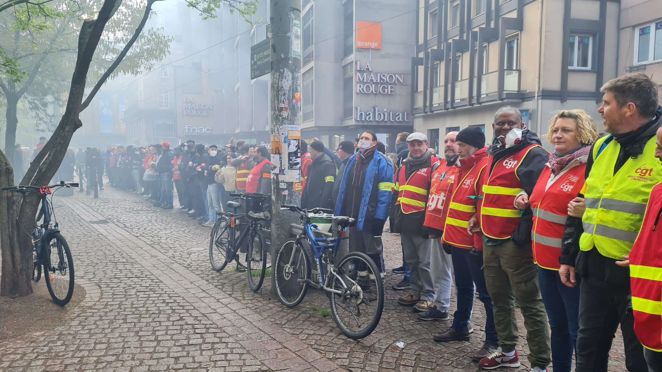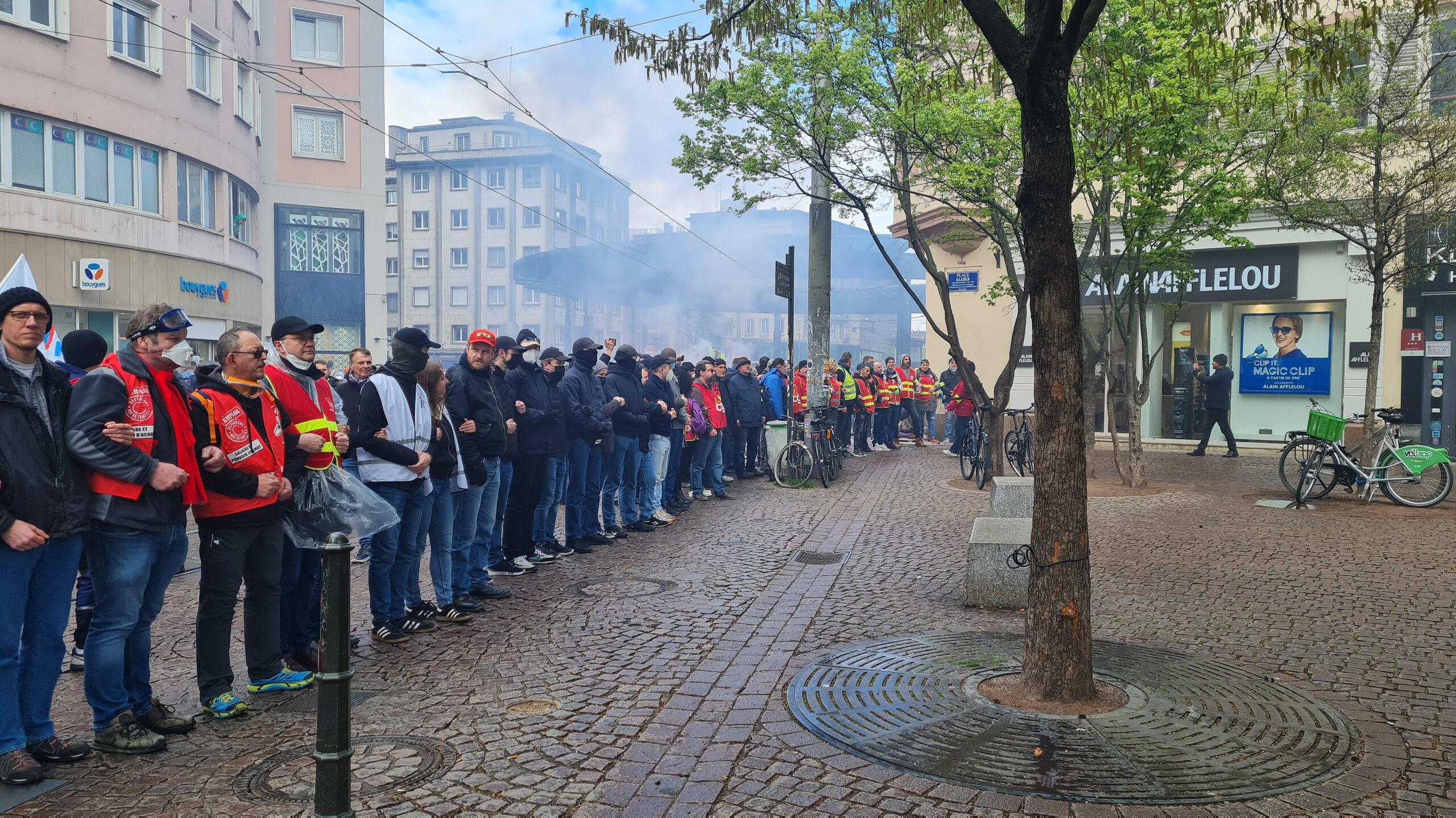 13h30, jeudi 13 avril. À une demi-heure du début de la manifestation intersyndicale, Gilles Dimnet briefe les services d’ordres syndicaux sur le parvis du Palais du Rhin. « Vous savez que c’était tendu la semaine dernière. Ceux qui ont des marbrures sur les cuisses s’en souviennent », entame le responsable du service d’ordre (SO) de la CGT, par ailleurs secrétaire général adjoint de la CGT Eurométropole :