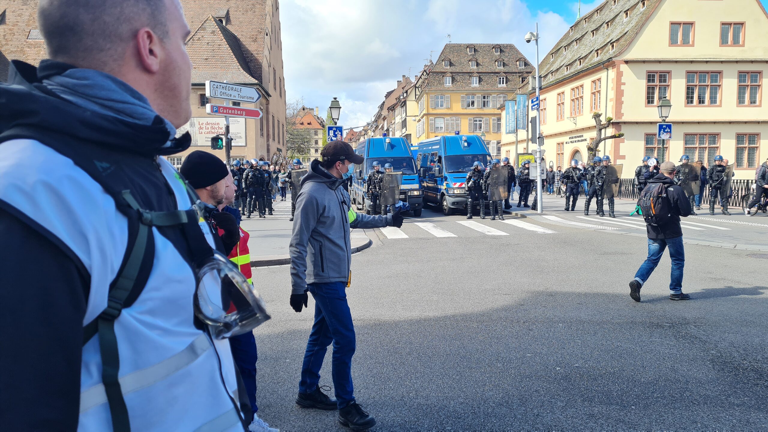 Entre les deux déploiements cependant, une partie du défilé a bifurqué en sortant de la place de l’Homme-de-Fer pour quitter l’itinéraire de l’intersyndicale et partir en manifestation spontanée. « Dans ces cas-là, on ne les retient pas. Ce n’est pas notre rôle », détaille Florence Fogelsang, co-secrétaire de la FSU 67 et présente dans le SO de son syndicat. « En revanche, on veille à ce que ceux qui partent comprennent qu’ils ne suivent pas le cortège déclaré », ajoute-t-elle.