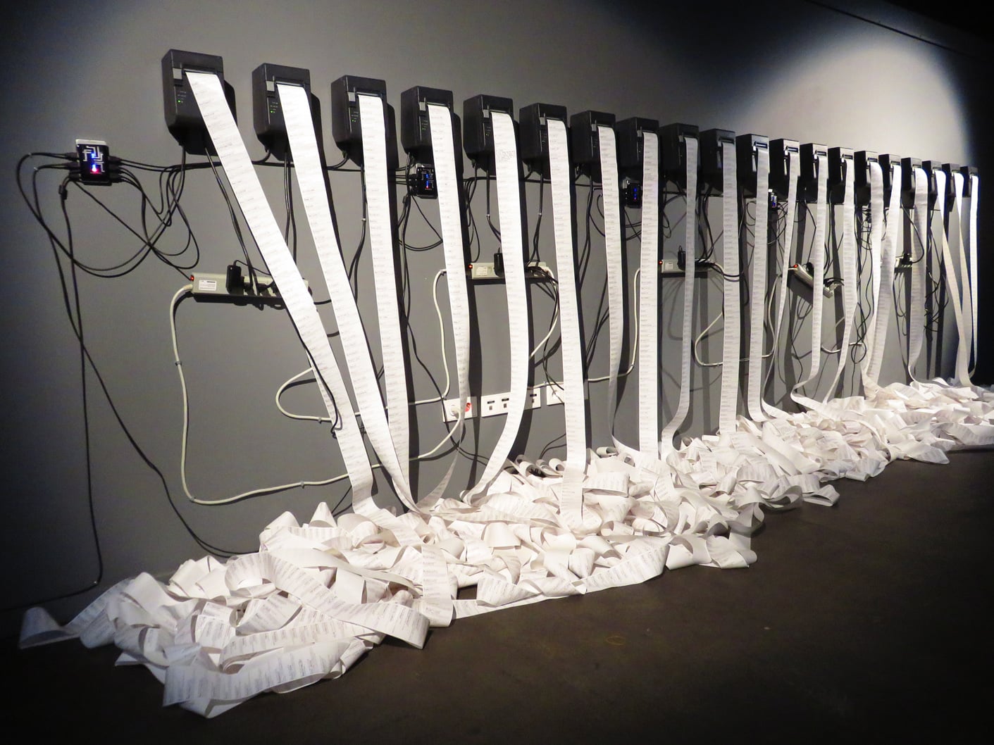 Sur le mur en face, le ventilateur fait également frémir des bandes de papier crachées par une rangée d’imprimantes thermiques. Il s’agit de l’œuvre de l’américain Christopher Baker, qui a relié vingt machines à Twitter, chacune d’elles répertoriant les posts correspondant à des émotions exprimées par des interjections telles que wow, OMG ou arrrgh. Si elle souligne la superficialité des messages individuels, l’œuvre dans sa globalité nous fait éprouver l’aspect vivant et organique du web.