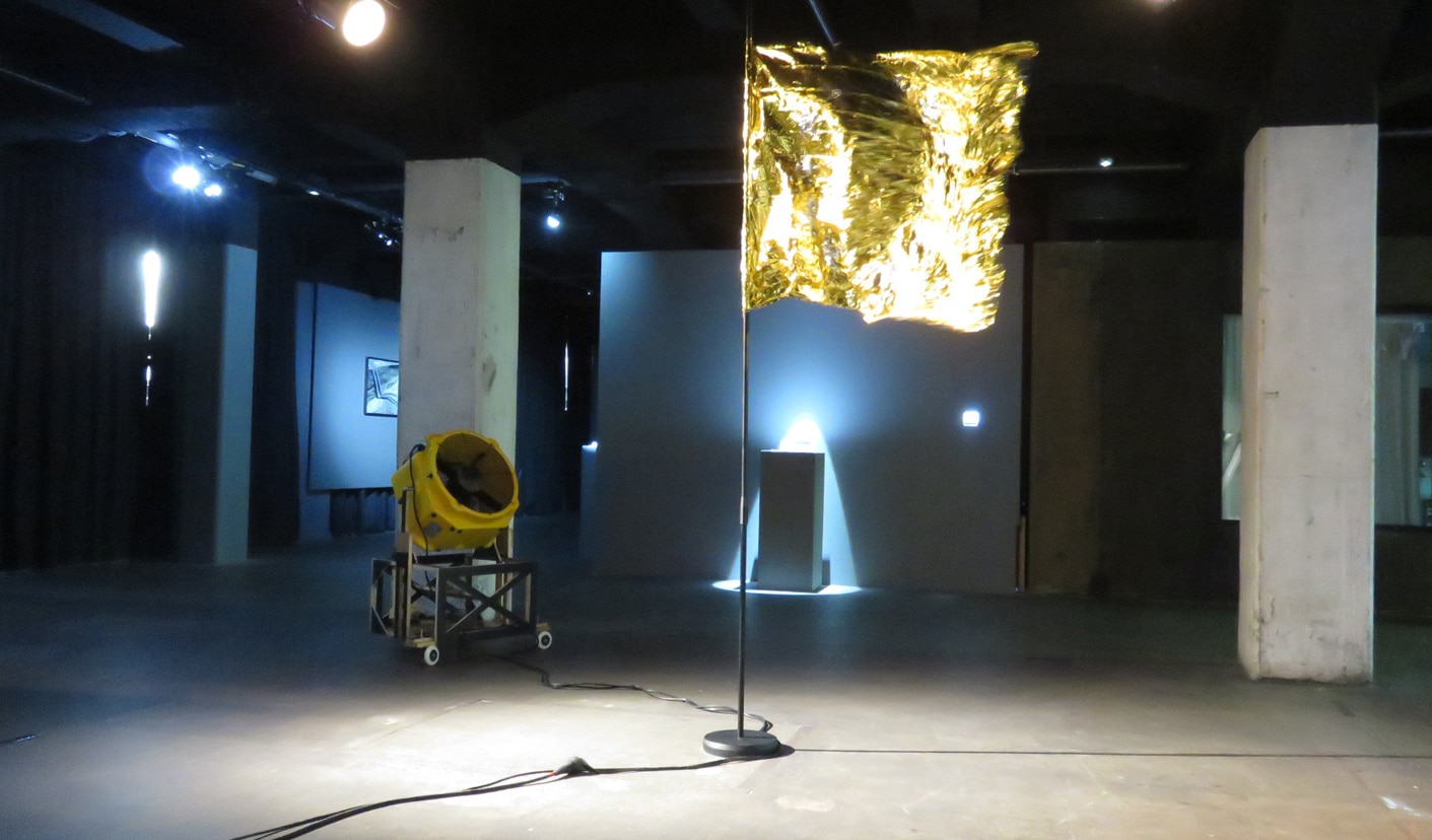 Julien Fargetton s’est emparé du sujet ô combien actuel des migrants, en faisant ressentir au spectateur les variations en temps réel du vent en mer Egée. Un gros ventilateur recevant les données d’une station météo se déplace autour d’un drapeau européen fabriqué à partir d’une couverture de survie, objet symbolique des sauvetages de migrants.