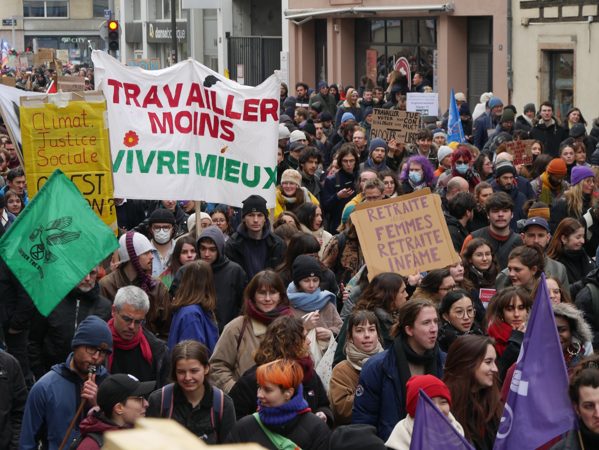 Alors que le cortège commence à se mouvoir, un premier embouteillage se forme déjà devant le Théâtre national de Strasbourg. Un petit groupe d’élus municipaux, entourant la maire Jeanne Barseghian, draine à eux des manifestants et quelques journalistes. Sa participation – avec deux béquilles – est remarquée et ravira ses alliés communistes, toujours friands d’un engagement plus visible contre la réforme des retraites.