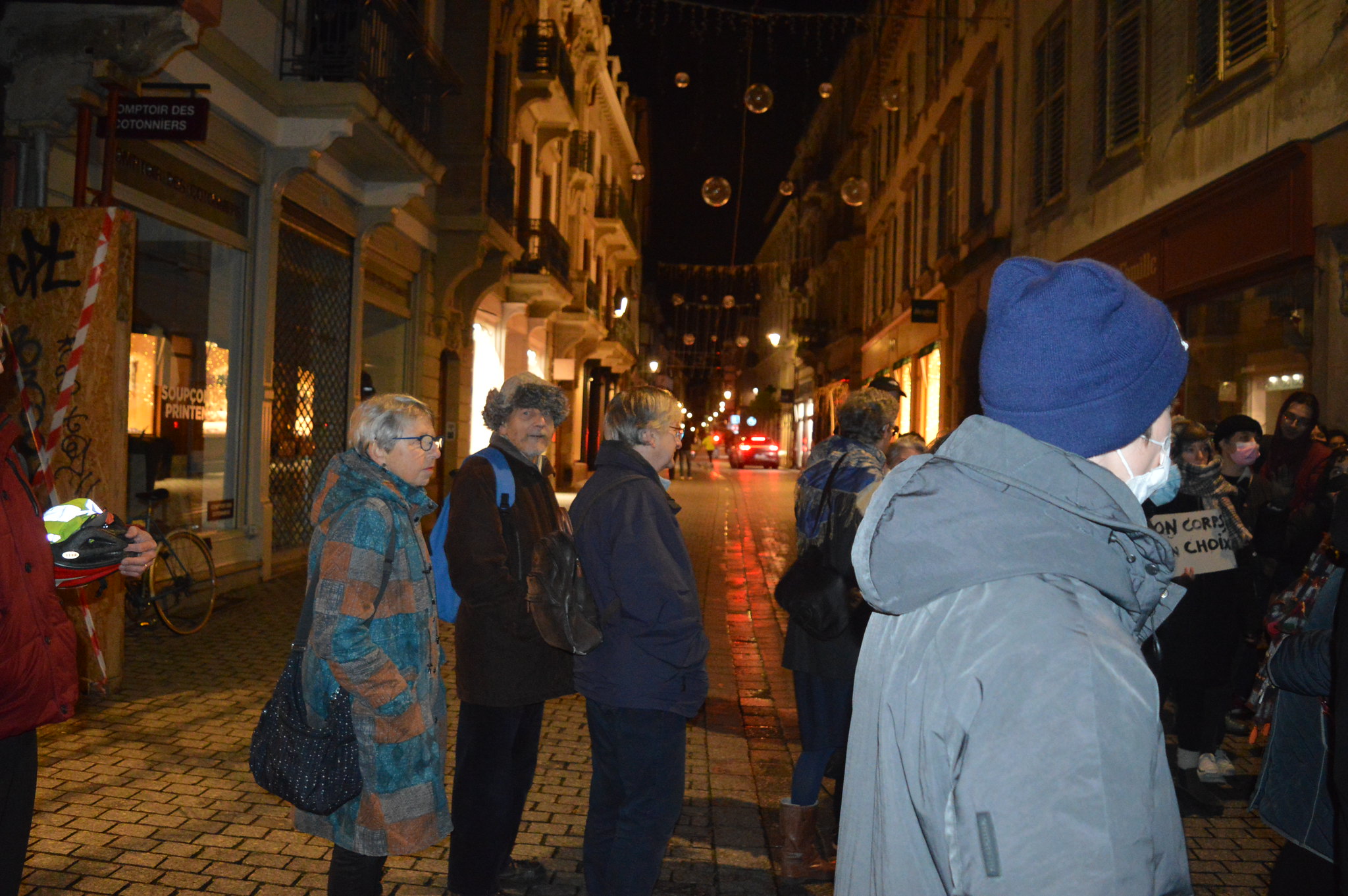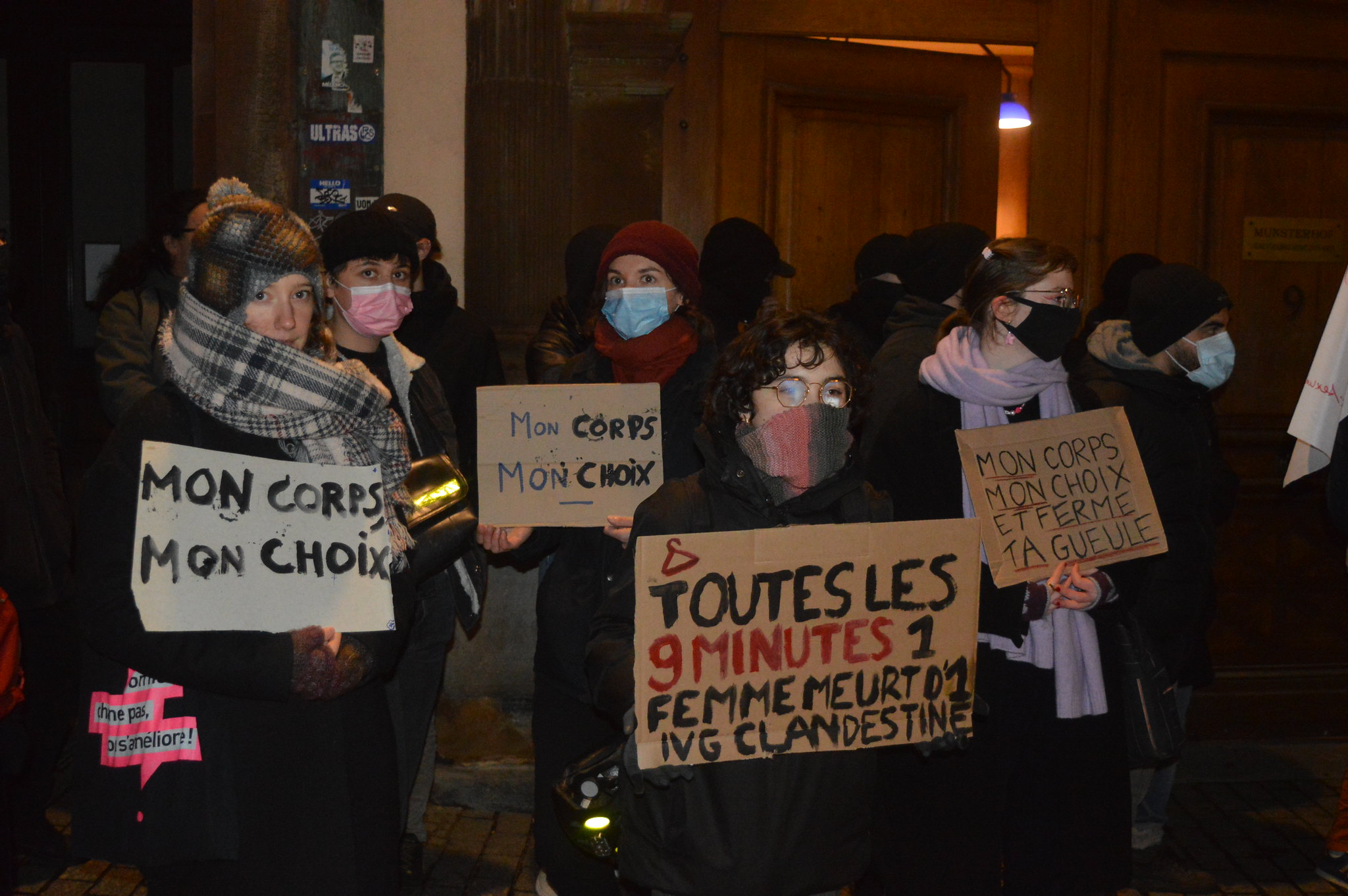 « Mon corps, mon choix, et ferme ta gueule ! » Une soixantaine de militantes clament le slogan avec force. Elles font bloc devant la salle polyvalente du foyer paroissial du Munsterhof situé au centre-ville, rue des Juifs. Il est 20h15. La première séance d’un « cycle de formation en bioéthique » organisé par l’Alliance vita doit commencer un quart d’heure plus tard. « Ils se disent pro-vie. Ces personnes sont opposées à l’avortement, l’euthanasie. Ils sont homophobes. Nous voulons leur montrer qu’on les a à l’œil, qu’il y a une résistance », explique Gaby (prénom modifié), l’une des activistes.