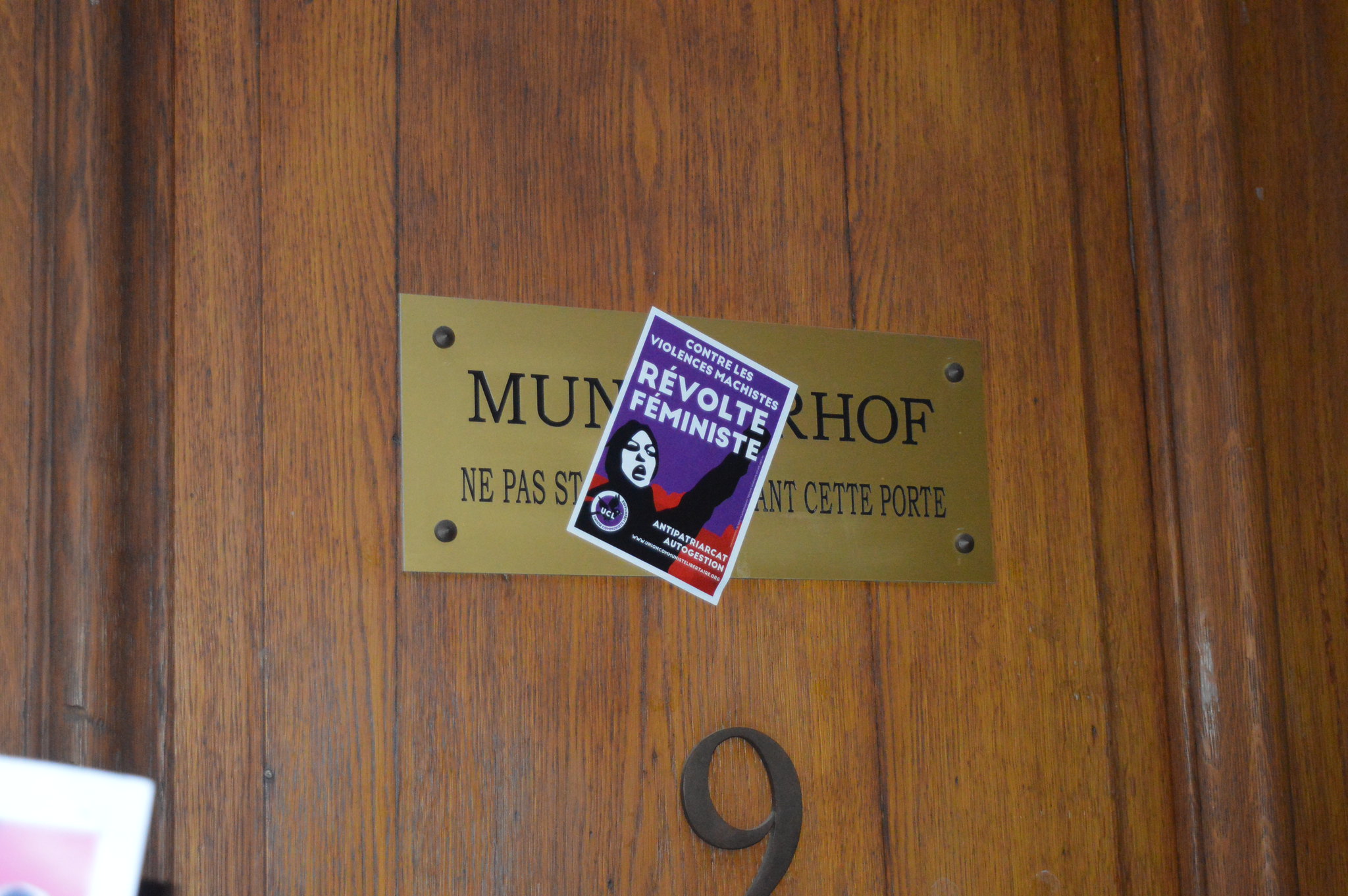 La porte du Munsterhof est désormais protégée par les policiers. Six ou sept personnes entrent dans le foyer paroissial à 21h50. Les manifestantes, dont les rangs se sont amoindris au cours de la soirée entonnent un dernier chant (« Derrière la police, les fascistes ! ») avant de se disperser. Un policier glisse : « Salut les gauchiasses ! », ce qui provoque de l’agacement chez les militantes. Elles considèrent que la mobilisation est réussie. « Pour une action organisée aussi rapidement, il y avait du monde et leur conférence doit être quasiment finie », estime Jacqueline. Un peu après 22h, les forces de l’ordre quittent les lieux. Seul un sticker « révolte féministe » reste sur la plaque du Munsterhof.