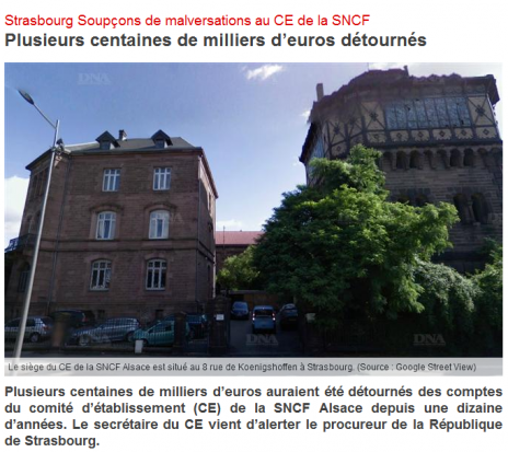 Selon les Dernières Nouvelles d’Alsace, les comptes du comité d’établissement (CE) de la SNCF Alsace auraient été dilapidés de plusieurs centaines de milliers d’euros. Selon une source interne, le montant pourrait dépasser le million d’euros. Le parquet de Strasbourg a enregistré la plainte arrivée sur le bureau du procureur de la République la semaine dernière.