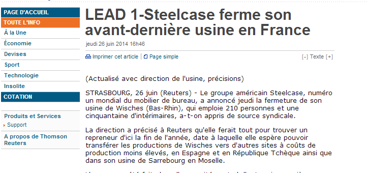 L’objectif de Steelcase est de réaliser près de 10 millions d’économies par an en transférant sa production vers des sites où la main d’œuvre est moins chère, comme l’Espagne ou la République Tchèque. La direction a promis aux quelques 210 employés et à la cinquantaine d’intérimaires de trouver un repreneur d’ici la fin de l’année.