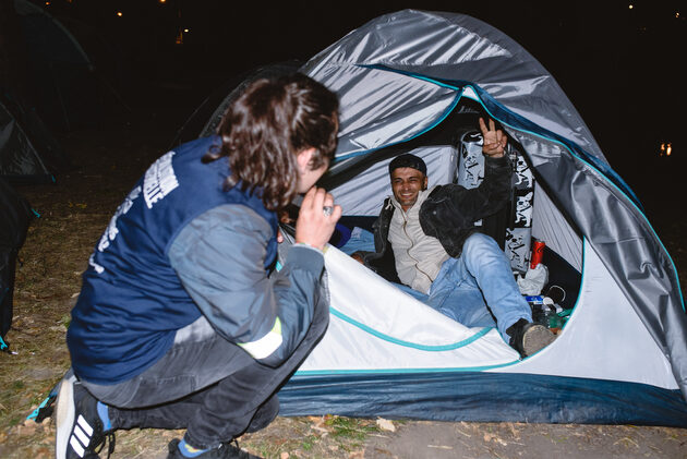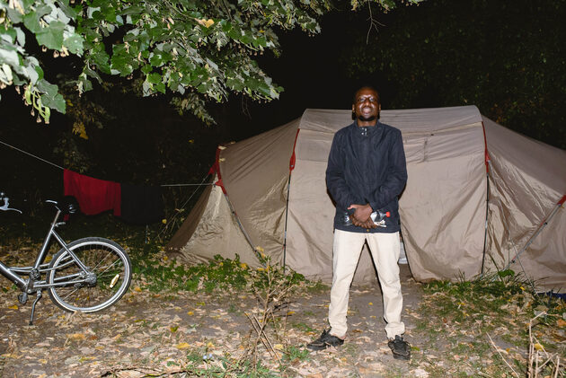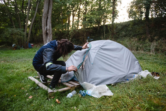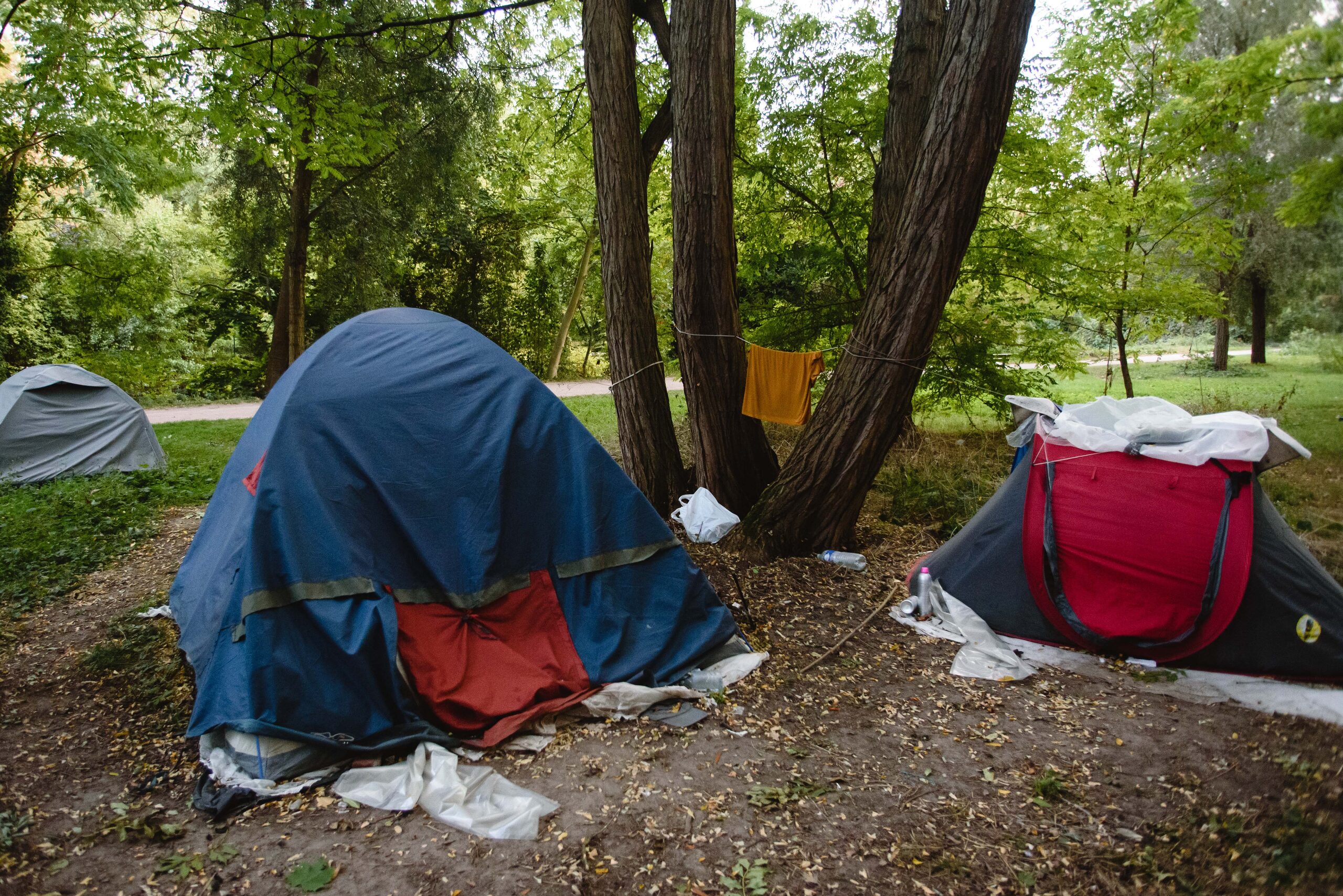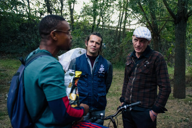 En l’absence de réponse, le bénévole tire les fermetures Éclair pour regarder à l’intérieur. « On ne sait jamais, il peut y avoir quelqu’un de trop faible pour répondre. Ou une personne décédée. C’est déjà arrivé. » Grégorias, son binôme, revient lui aussi bredouille. Un homme passe à vélo et s’arrête à leur hauteur. Il désigne du doigt le remblai sur lequel il a installé sa tente il y a trois mois et d’où il « veille » sur le camp. Selon lui, la majorité des personnes vivant ici sont parties à la gare pour la distribution alimentaire de l’association Abribus.