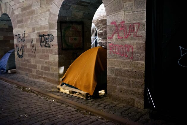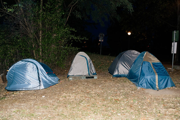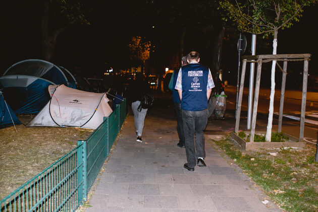 Un œil sur le volant, l’autre sous le couvert des arbres, Grégoire Spitz compte silencieusement les tentes en traversant le parc du Glacis de Strasbourg, un jeudi soir d’octobre. « Cela faisait un moment que nous n’étions pas venus et il y en a des nouvelles », relève ce bénévole de l’association Caritas avant de s’arrêter. « Bonjour, c’est la maraude ! Il y a quelqu’un ? », hèle-t-il en s’approchant d’un petit groupe de toiles tendues le long du sentier, montées sur des palettes et recouvertes de bâches étanches.
