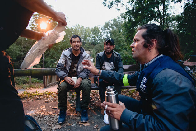 L’équipe s’approche d’un petit groupe d’hommes rassemblés au centre de quelques tentes, autour d’une grande gamelle fumante. « Vous voulez goûter ? », propose un des convives tandis qu’un autre se lève discrètement et dégaine son téléphone. La conversation s’amorce entre les bénévoles et les habitants du camp, avec ici encore la musique d’attente du 115 en fond sonore. Drôle d’écho diffusé par plusieurs combinés en même temps. Chaque communauté du campement tentant sa chance.