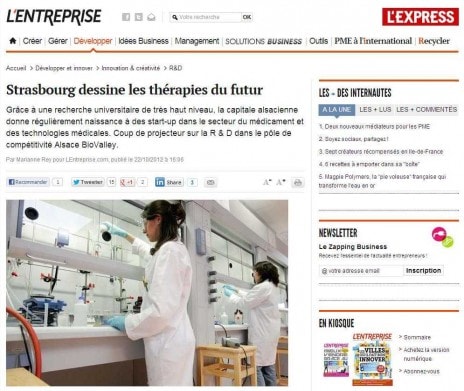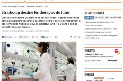 Le mensuel économique L’Entreprise (Groupe L’Express) revient sur Alsace BioValley et le positionnement de Strasbourg comme secteur en pointe sur la recherche médicale. Gros appareillage hospitalier, outils pour les chirurgiens, robotique à vocation thérapeutique ou chirurgicale, implants, et organes artificiels… Avec l’Institut de recherche contre les cancers de l’appareil digestif (Ircad) en « vaisseau amiral », la dynamique commence à prendre à Strasbourg selon le mensuel qui précise que d’ici à 2016, 30 000 m² seront consacrés uniquement à l’accueil de sociétés spécialisées.