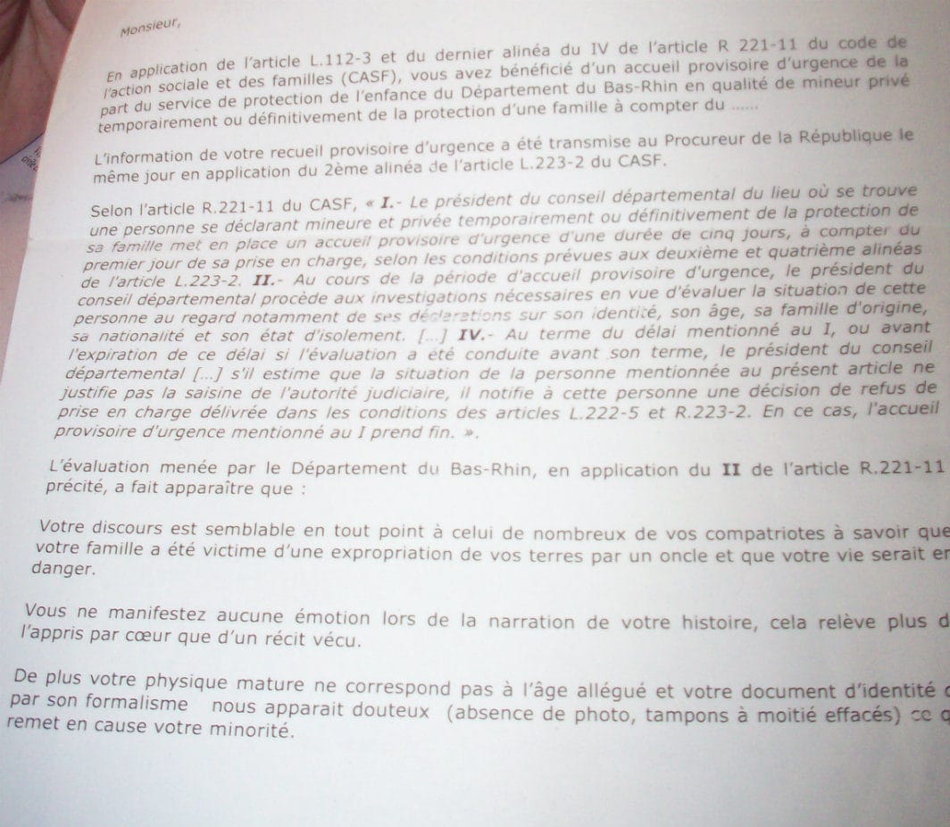 S’ensuit alors une audience auprès du juge des enfants, qui peut décider du placement des mineurs. Cette fois, l’un d’eux a pu montrer un acte de naissance envoyé par un ami en Guinée. Là encore, la requête est rejetée : le récit ne serait pas cohérent, la véracité des documents est douteuse.