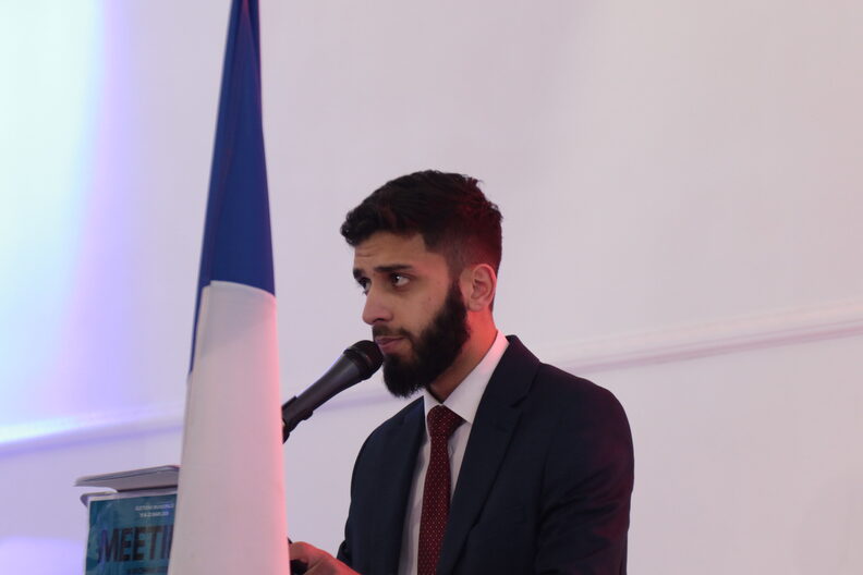 Puis Fahad Raja Muhammad entre en scène. Main sur le cœur, posture à la Chirac, il salue la salle. Costume sombre, cravate rouge, il se fond dans un décor saturé de symboles tricolores. Derrière lui, un drapeau français trône sur l’estrade, encadré de néons bleus et rouges. On rappelle son parcours : fondateur du collectif, deux ans à la tête de l’association des Étudiants musulmans de France, chef d’entreprise dans l’informatique.
