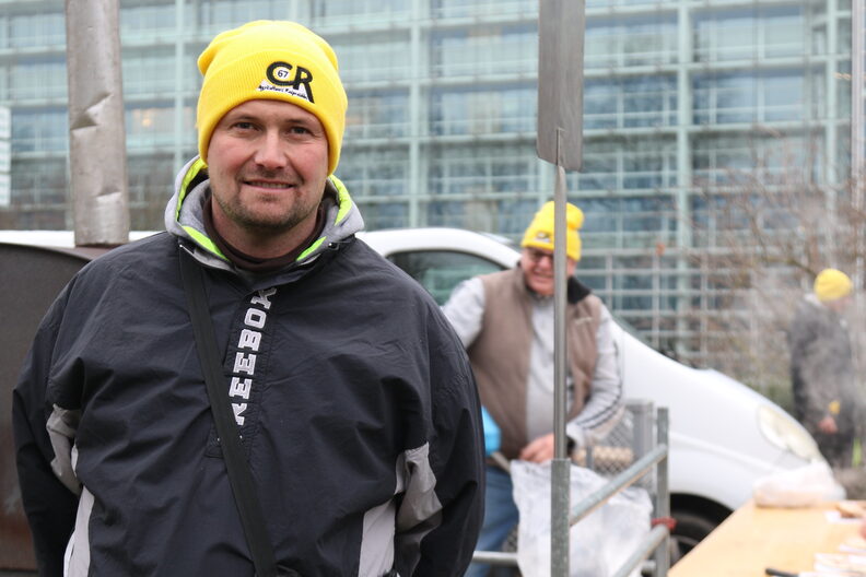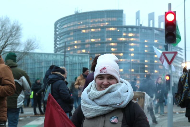 Inès Lochert a 18 ans. Elle est venue avec la Coordination rurale, tenue à distance du rassemblement de la FNSEA par un cordon de policiers. Tout juste majeure, elle aide dès qu’elle peut dans l’élevage bovin de sa belle famille à Stosswihr. « L’objectif c’est qu’on reprenne l’exploitation avec mon copain », explique t-elle. Encore en formation au lycée agricole d’Obernai, elle reste motivée à s’engager dans cette voie malgré les menaces. « Je ne me pose pas la question, c’est comme ça ce métier, c’est une passion. Mais c’est sûr que ça fait peur le contexte. »
